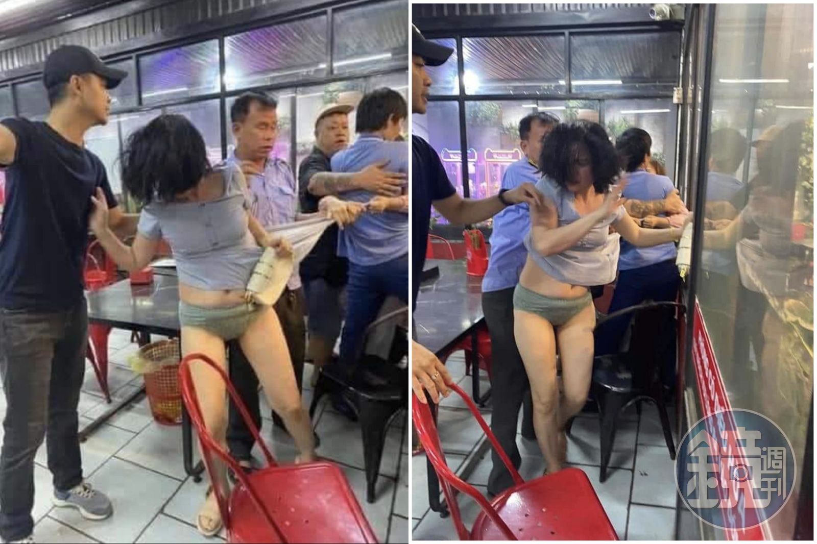 雖然出軌夫試圖分開正宮與小三,但力量似乎鬥不過怒氣在最高點的正宮,之後餐廳老闆以及商場保全都來到現場,這時才將正宮與小三成功分開。但小三因為穿著連身裙,所以她被正宮攻擊後,不僅披頭散髮,裙底也全都被拉上來,導致她意外洩春光,更透出她宛如《黑暗榮耀》空姐的爆乳魔鬼身材。