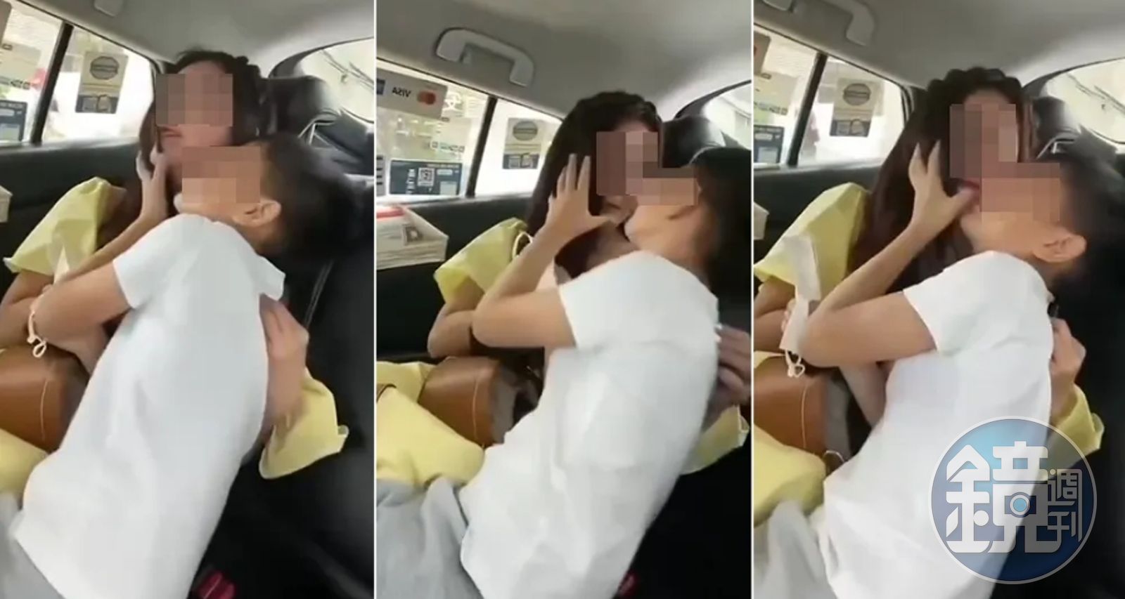 母子在車內拉拉扯扯一翻,兒子接著還輕撫媽媽臉頰和嘴唇,網紅一開始原先不太不理會,但下秒又轉頭與兒子熱吻,然後母子倆深情擁抱在一起。