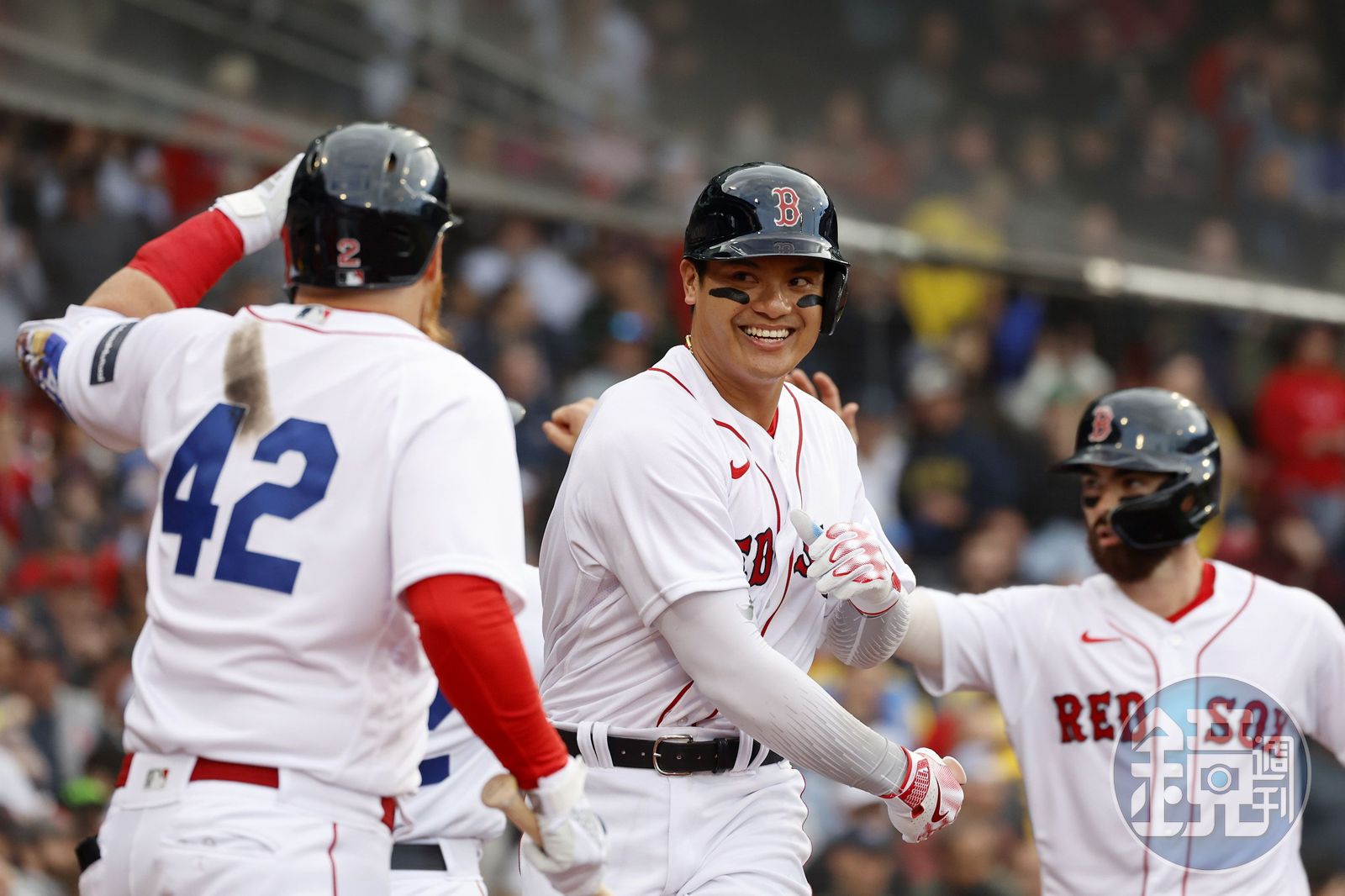張育成昨日向球隊告假,視訊陪產。喜迎愛女回歸隊上後,就轟出全壘打。(翻攝@BostonDotCom推特)發布時間:2023.04.21 06:59 臺北時間
