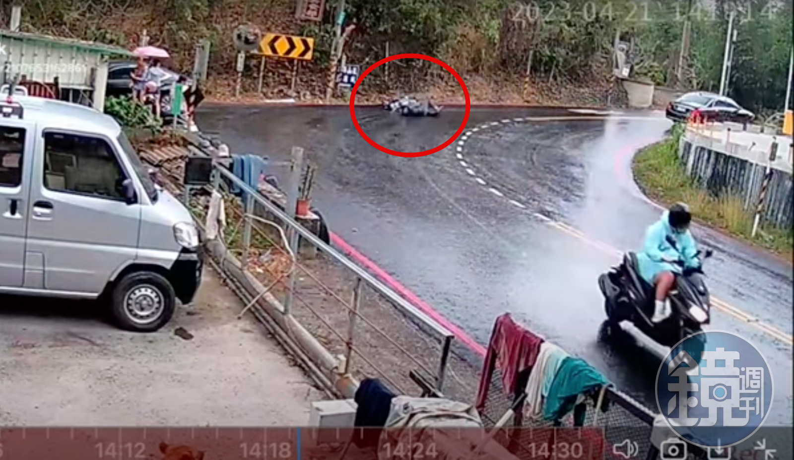 從影片中可見,許多機車騎士行經該彎道時,不是撞上護欄,就是過彎自摔,且白天、黑夜都有車禍發生。就在昨日、4月22日下午6點許,也有一名機車騎士轉彎時速度過快失控暴衝,機車直接滑向山壁,導致附近住家的黑、黃狗被驚動瘋狂吠叫。