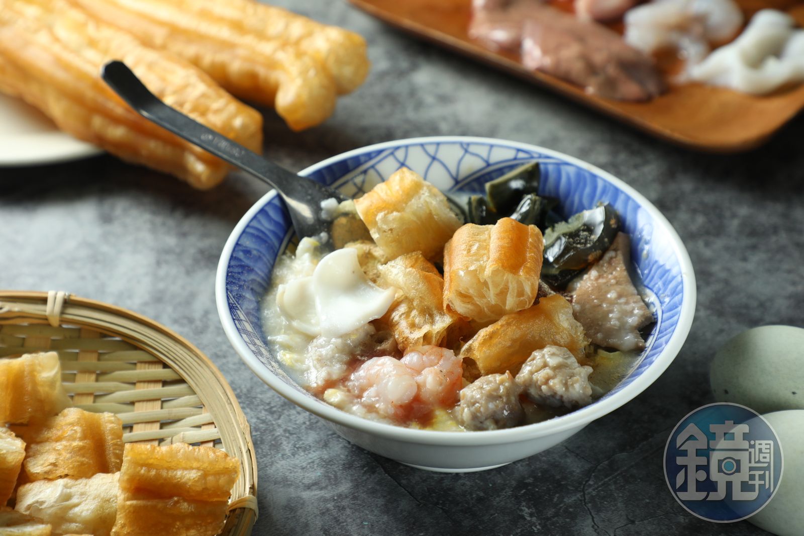 除了「金門招牌及第粥」其餘選擇都是黃銘逸自創的口味,像是還有以海陸食材為主的「荔灣艇仔粥」品名相當趣味,黃銘逸爽朗笑說「荔」代表形狀像荔枝的肉丸,「灣」則象徵彎彎的白蝦仁,「艇」則是現撈花枝去中心蒂後的那一塊形狀,另外加上豬肝和瘦肉片,食材給得相當霸氣。