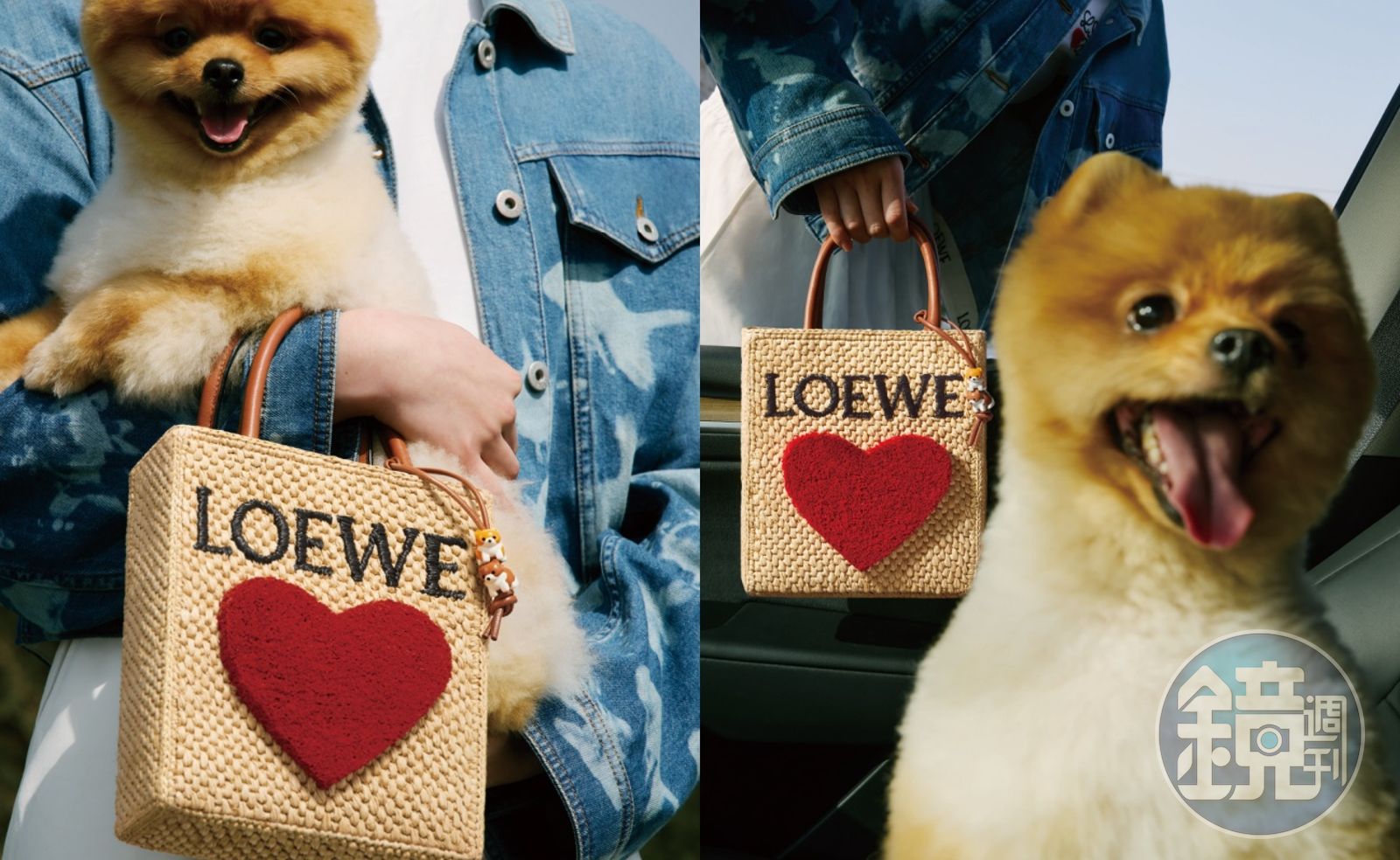 LOEWE 520情人節特別企劃有令人融化的可愛博美入鏡,以及可愛的毛茸茸的大愛心托特包。(LOEWE提供)發布時間:2023.04.29 08:43 臺北時間