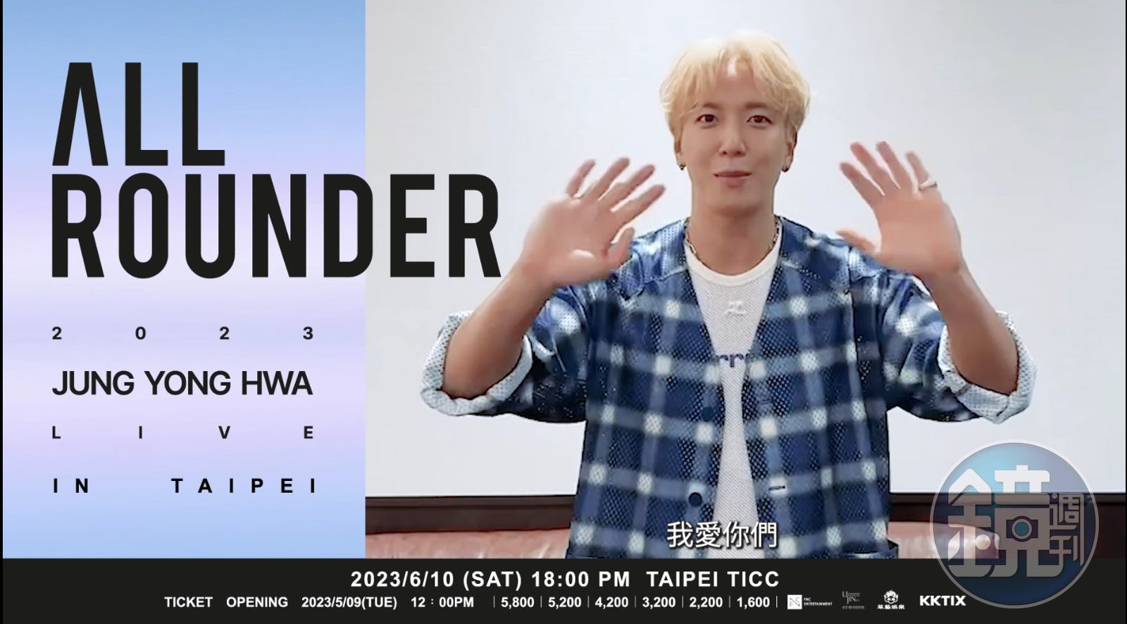 除了期待當天感受最棒的演出,由於6/22是鄭容和的生日,加上見面會訂在6/10舉辦,因此消息一出後,主辦單位華藝娛樂便收到排山倒海的BOICE訊息,當中不乏包括提出的應援企劃裡,由於等了4年才盼到鄭容和,因此無不希望能偷偷搶先為他準備驚喜的慶生橋段,期待當天能讓鄭容和與所有BOICE擁有美好回憶!即將在6/10(六)PM6:00,於TICC台北國際會議中心舉行韓系實力神團CNBLUE隊長鄭容和的「2023 JUNG YONG HWA LIVE 'ALL-ROUNDER' IN TAIPEI」,啟售日訂為5/9(二)PM12:00於「KKTIX網路、全家機台」售票,購票網址:https://dragonartinc.kktix.cc/events/ab0dda35,活動票價訂為「VIP5,800元、A區5,200元、B區4,200元、C區3,200元、D區2,200元、E區1,600元與身障席2,900元」,福利等更多活動詳情,請注意華藝娛樂官方FB:https://www.facebook.com/DA.tvEntertainment查詢。