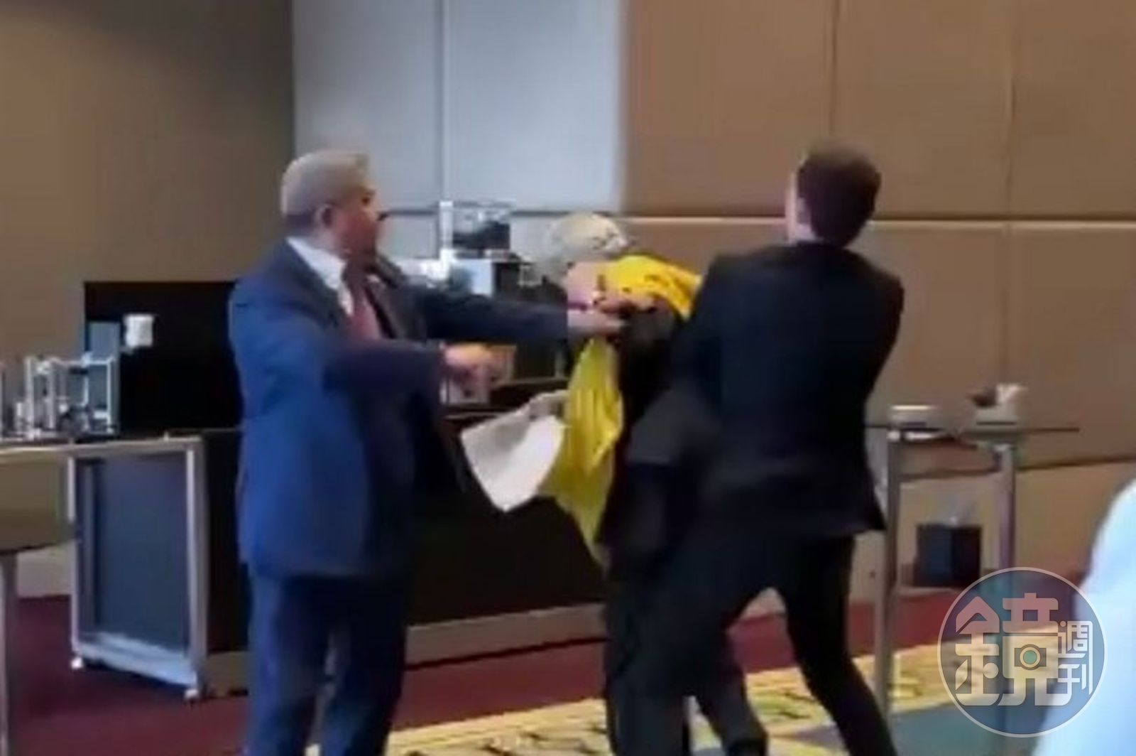 但烏國議員也不是省油的燈,面對俄國戰狼,烏國議員也同樣以戰狼方式反擊,當場對這名奪國旗的俄國官員一拳K爆,引發肢體衝突,最後烏國議員成功奪回國旗。至於旁邊的其他人員見狀後,立刻將兩人分開,避免兩人再有進一步衝突。
