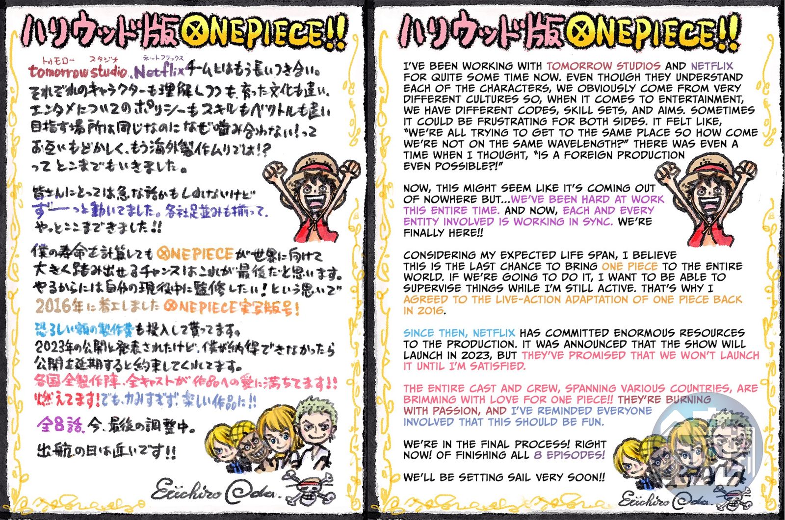 此外,尾田對團隊相當滿意,他表示:「這部作品匯集了全國各地的製作陣容以及卡司,大家對《航海王》都有滿滿的愛!更燃燒著熱情!不過我也提醒團隊不要過度用力,一定要打造出最有趣的作品給觀眾。」並同時預告目前已經進入最終調整,「距離出航日不遠了!!」