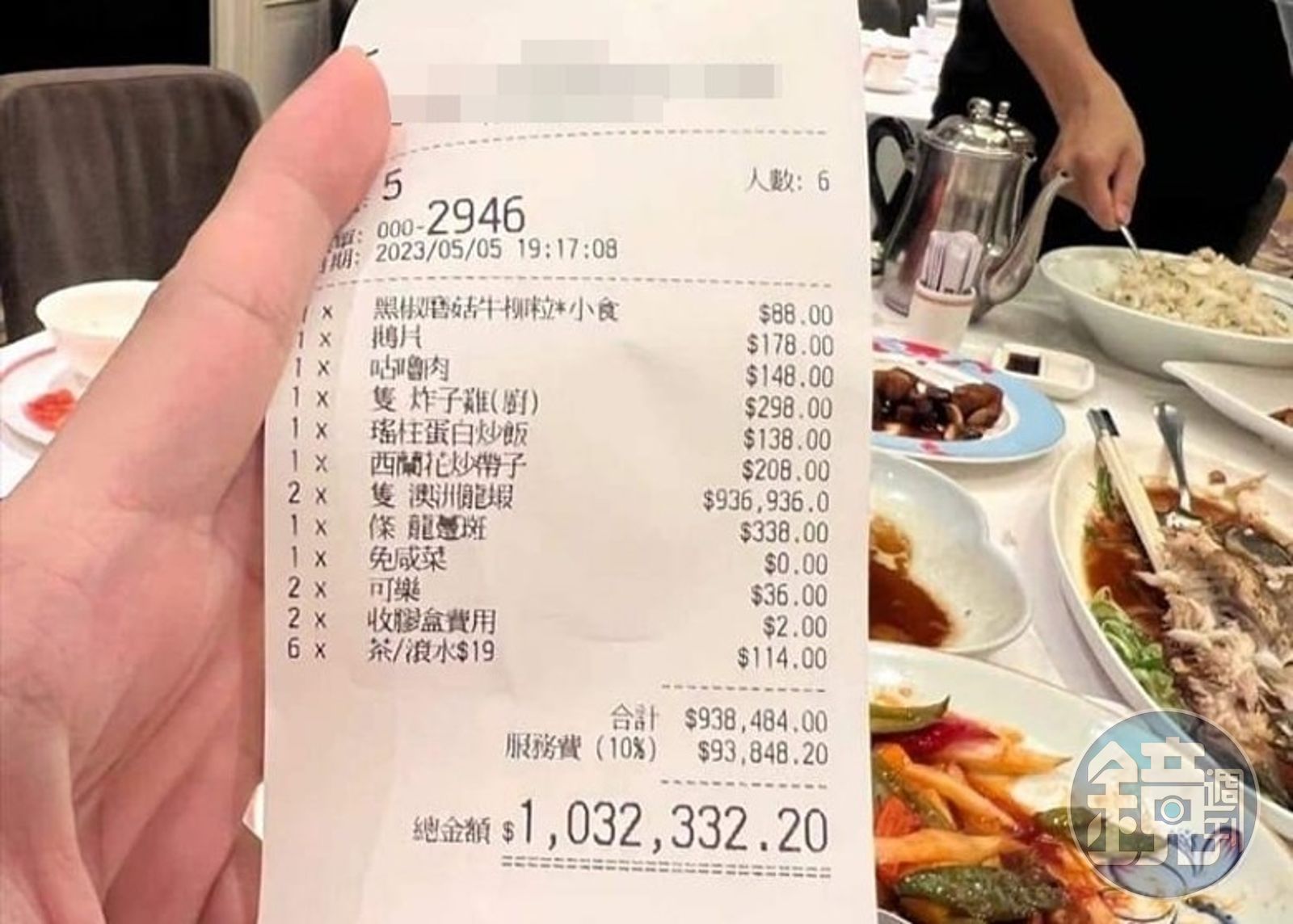 據了解,5日晚間6名香港民眾到「荃灣潮江春」餐廳用餐慶生,總共吃了8道菜,竟要價港幣103.2萬(約新台幣402萬元),民眾檢視帳單明細,發現一尾澳洲龍蝦的價格就要港幣46.8萬(約新台幣183萬元),服務費也要港幣10萬元,讓民眾當場傻眼。