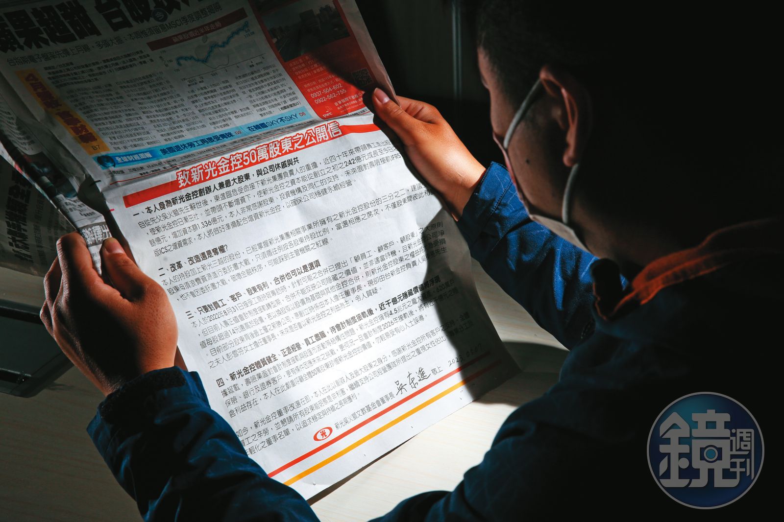 對於吳東進反擊,洪士琪也發聲明強調,新光金股東沒有合併議案,吳東進發文是企圖以合併掩蓋新光金績效不彰、有愧員工、股東事實,還妄稱掌握2/3股權,動搖股東改革決心,「突顯唯有全面改革新光金董事會,始能解決新光金控大股東干政亂象,讓新光金控有蛻變重生機會。」