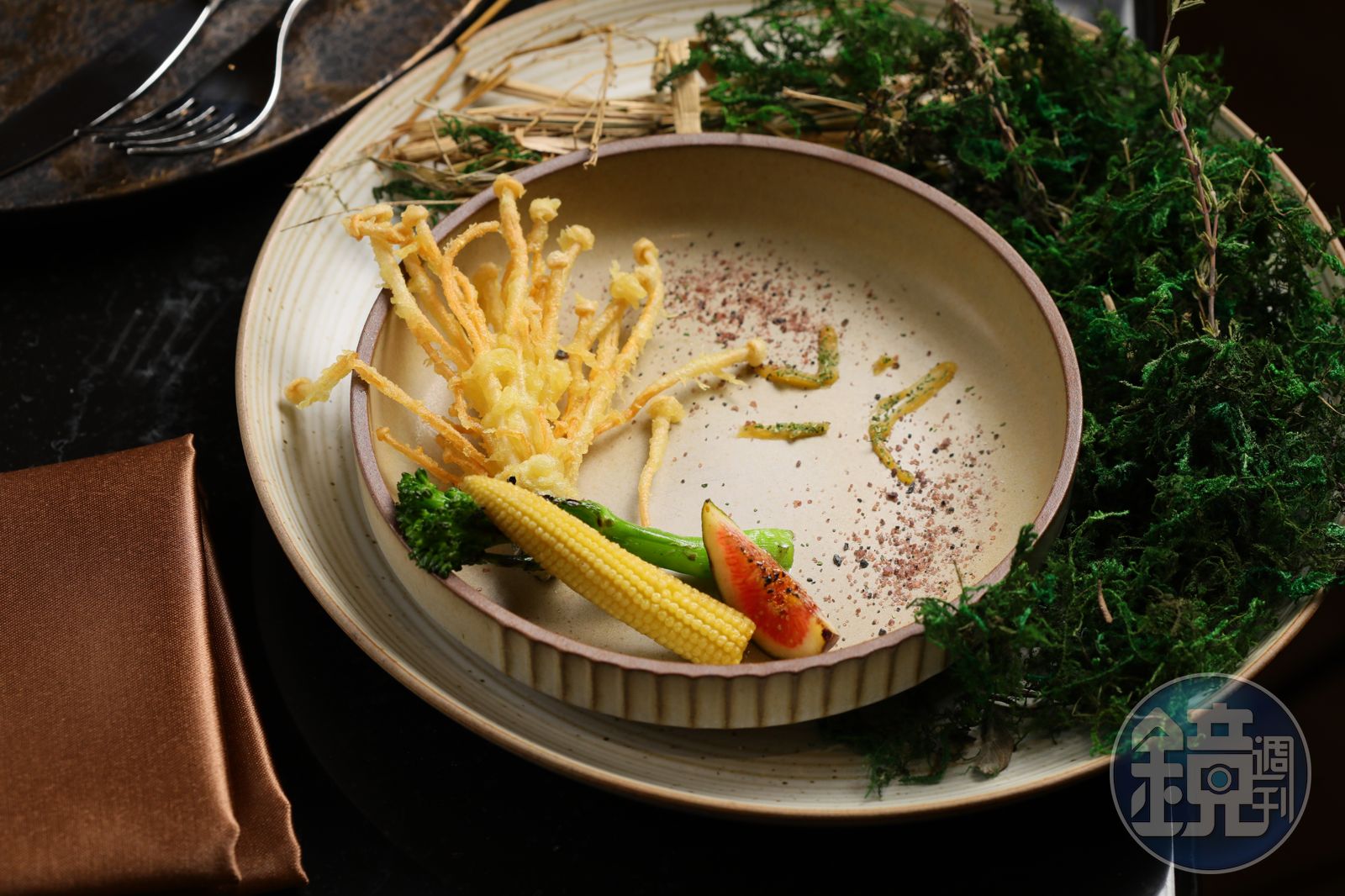來台時曾經與餐廳同事一起上陽明山吃野菜的Christine,對山上濃厚的硫磺味印象深刻,並激發了她的靈感,最終完成這道「有機蔬菜/味噌/黑礦鹽」。利用燒、煎、烤、炸四種不同烹飪手法,帶出蔬菜獨有的鮮甜,炙燒的無花果、乾煎玉米筍、炭烤青花筍及油炸的金針菇,搭佐帶著明顯硫磺味的黑礦鹽與味噌醬,吃一口青花筍,沾一點黑礦鹽,就像瞬移到陽明山上的野菜園,非常有意思。