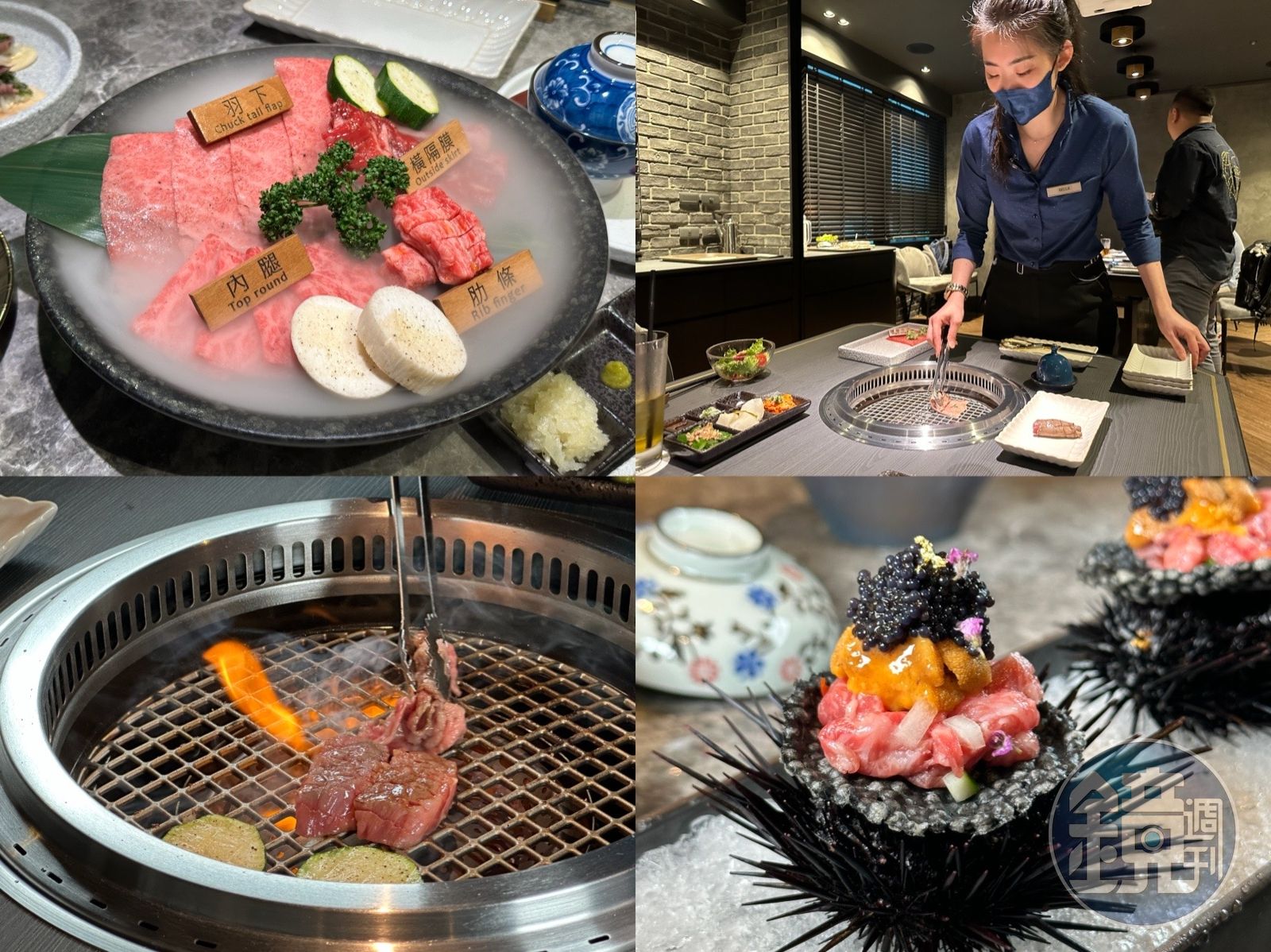 與第一間店最大不同之處,除了座位區更寬敞舒適,讓客人保有私密感,同時也把切肉室設置在座位區旁,讓客人可以清楚看到精肉師現切和牛的過程。肉品上桌也不需要動手,全程都有專人桌邊燒烤,呈現和牛最佳熟度,也會穿插肥、瘦部位,降低品嘗時的油膩感。