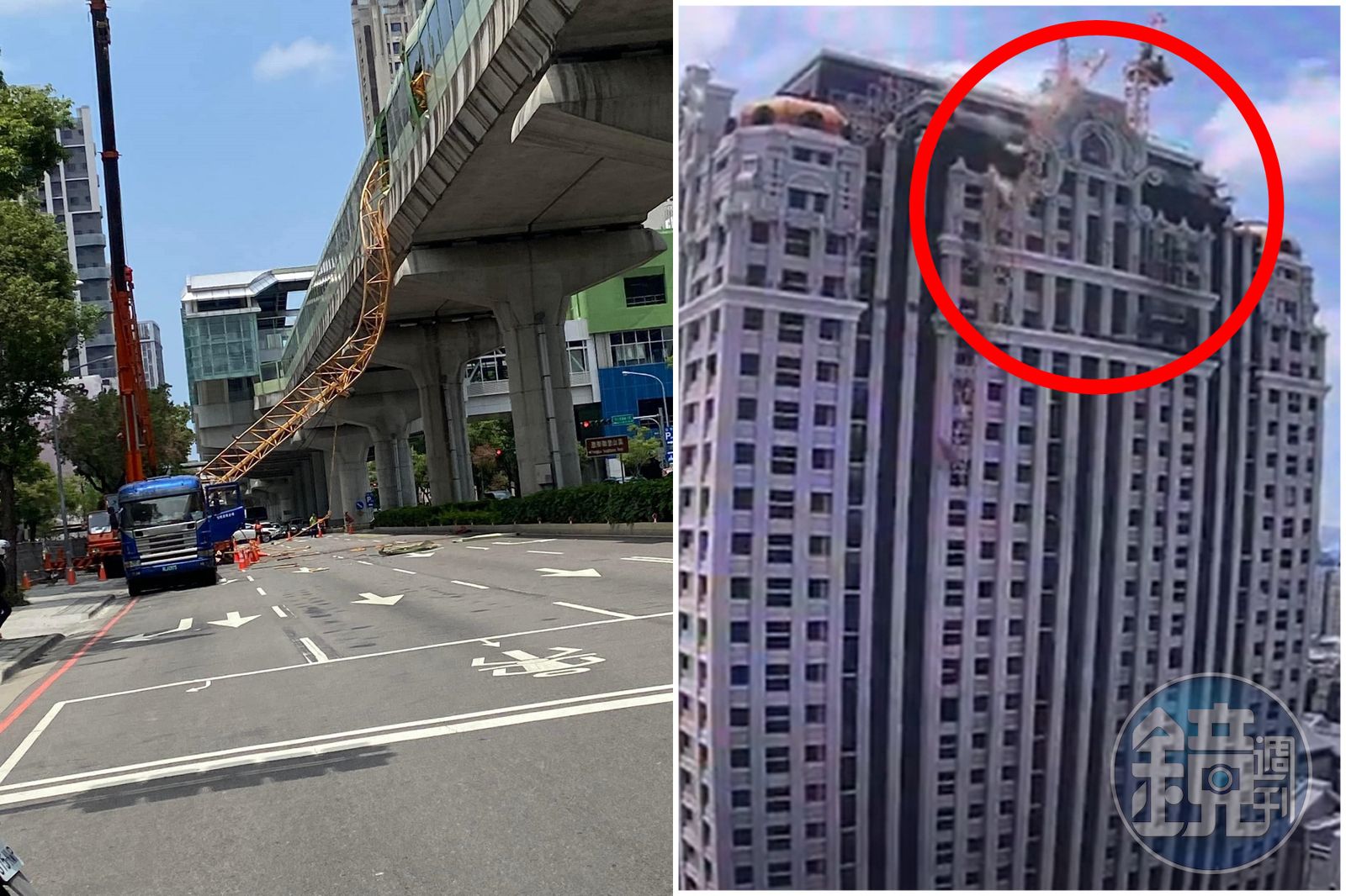 「金火鳥大樓」頂樓吊臂掉落瞬間影片曝光,重力掉落穿插台中捷運。(翻自劉士州議員臉書+記者爆料網)發布時間:2023.05.10 15:13 臺北時間