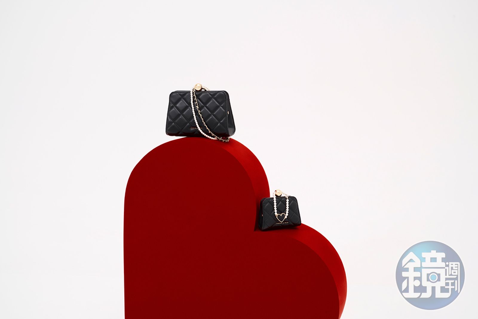 520定情禮盒以黑紅兩色的雙層設計作為呈現。NT$3,690(CHARLES & KEITH提供)上層的梯形輪廓肩背包結合菱格絎縫設計,搭配金屬圓球扣、皮編鍊條與珍珠鍊帶,帶出輕奢優雅的質感,而簡潔俐落的黑色搭配別緻珍珠設計,創造出奢華的時髦氛圍;下層放置著的是縮小版尺寸的菱格紋肩背包搭配愛心珍珠短鍊帶,珍珠鍊帶上點綴著黑色的心型裝飾,不僅可以別在包上做為提把,亦可以單獨當作手鍊使用,讓女孩們發揮自己的搭配創意,展現個人魅力。