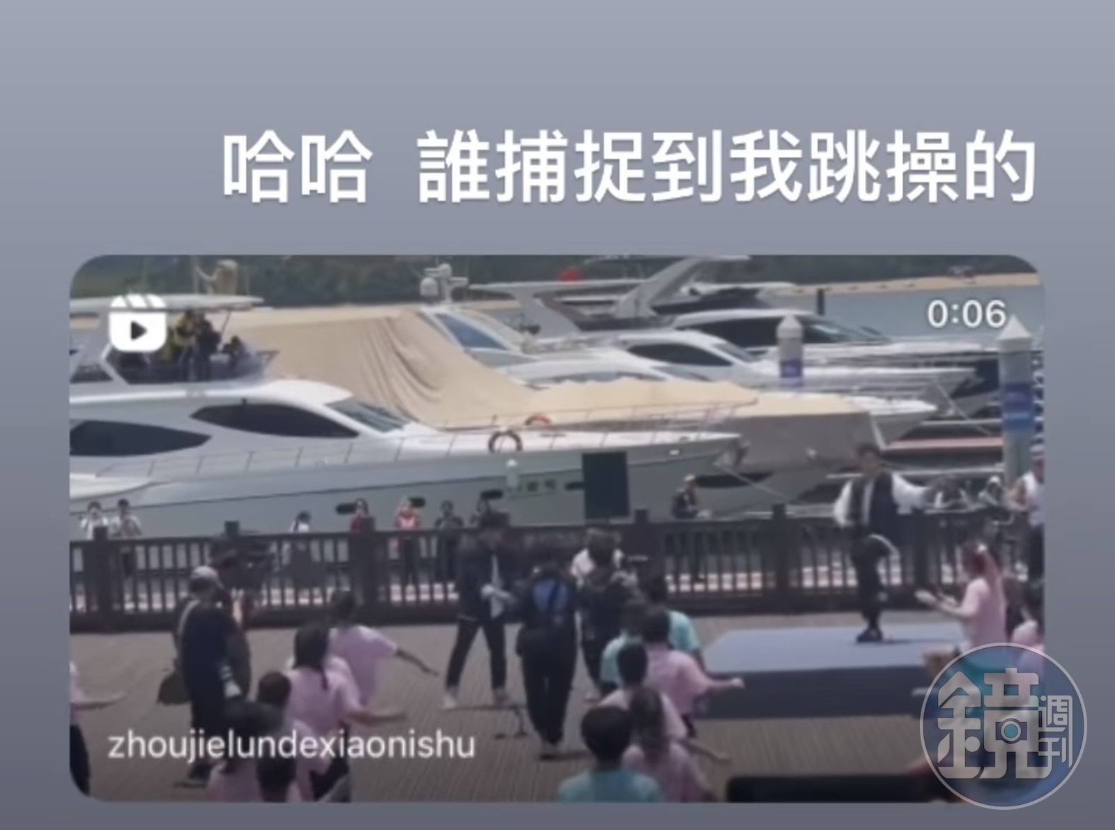 近來,周杰倫正在香港舉辦巡迴演唱會,日前趁休息時間分享搭飛機畫面,故作神祕不肯透露目的地,沒想到9日就被網友捕捉,他和劉畊宏等人出現廈門,只見一群人在某個疑似碼頭的地方,劉畊宏在正前方帶動跳〈本草綱目〉瘦身操,底下則有多位民眾跟跳,一旁還有攝影機,似乎在拍攝節目。 身為原唱的周杰倫,雖然沒有上舞台,但聽見自己的歌,最終還是忍不住跑到舞台側邊小秀一段跳了起來,對於被捕捉的身影,他也轉發回應:「哈哈!誰捕捉到我跳操的。」