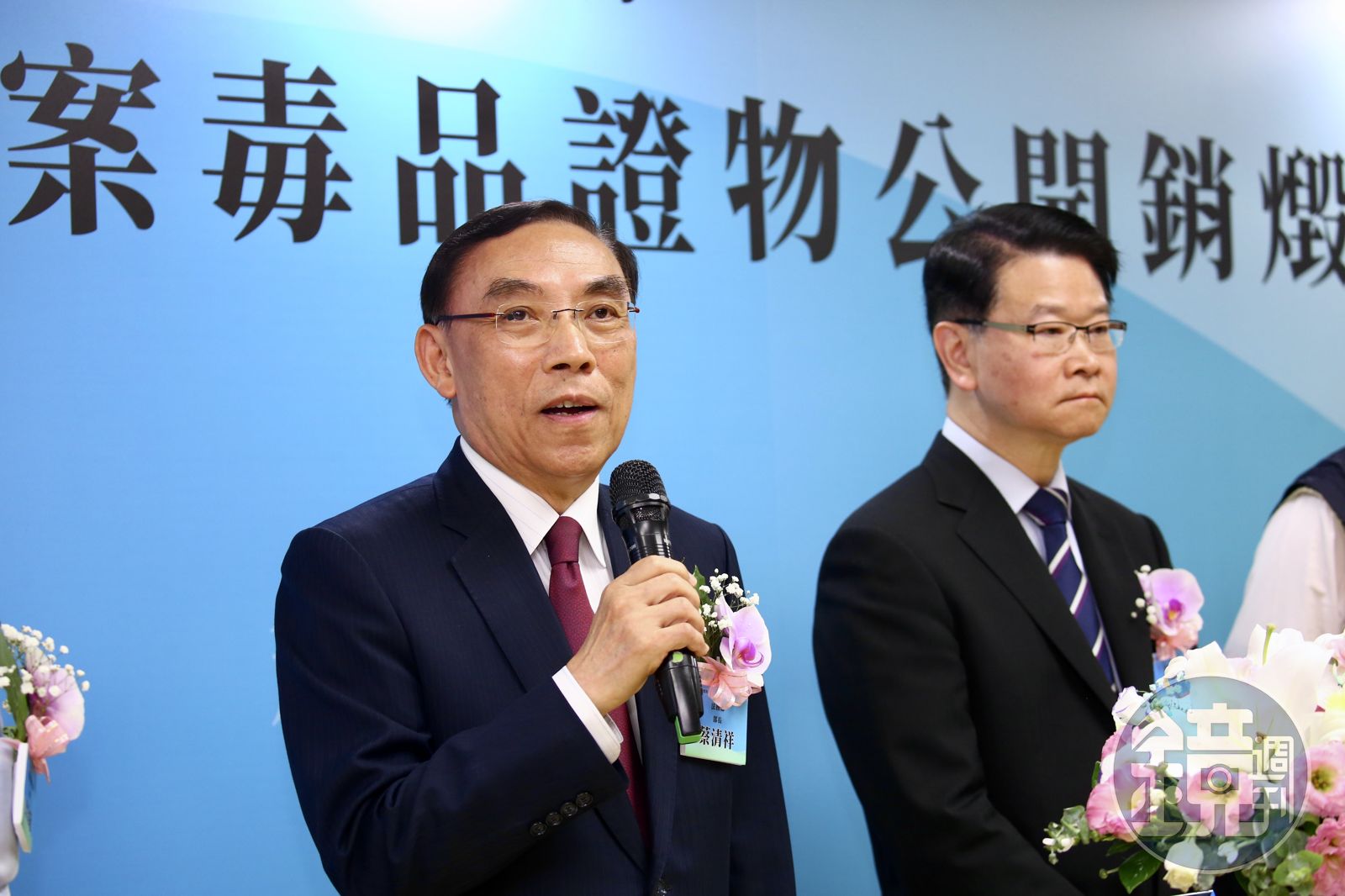 法務部長蔡清祥、調查局長王俊力、木柵垃圾焚化廠廠長梁金龍在下午兩點共同啟動毒品證物銷燬程序,此外,高檢署檢察官曾鳳鈴、消費者文教基金會秘書長陳雅萍、毒藥物防治發展基金會董事長鄧昭芳等人也在場一同見證,順利完成該批毒品銷燬作業。