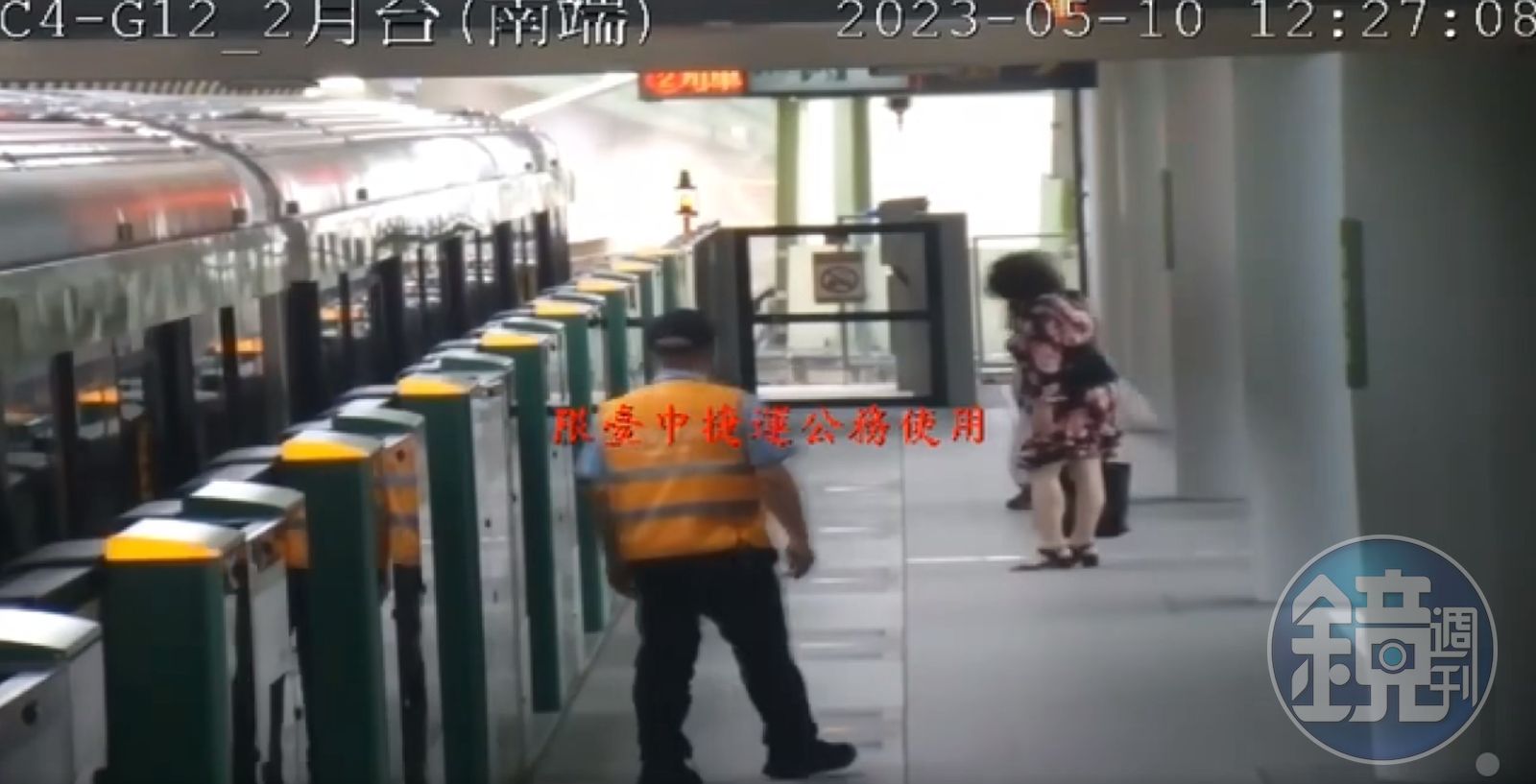根據影片時間顯示,捷運列車在中午12時26分50秒進站,14秒後,也就是12時27分04秒,從高樓掉落的吊臂砸破軌道隔音牆,掉落軌道上,也是該班列車準備開往的方向,造成劇烈聲響。站內保全人員在吊臂掉落2秒後回頭查看,緩步移動,這時捷運旅客上下車,直到12時27分14秒,保全人員才看清楚軌道情況、驚覺事態嚴重,急忙向站長回報,這時捷運上的隨車人員還沒發現,確認旅客上下車完畢後準備發車,到了12時27分26秒,隨車人員才發現異狀,呼叫行控中心,並拿鑰匙開啟駕駛台蓋板,進行列車煞停。