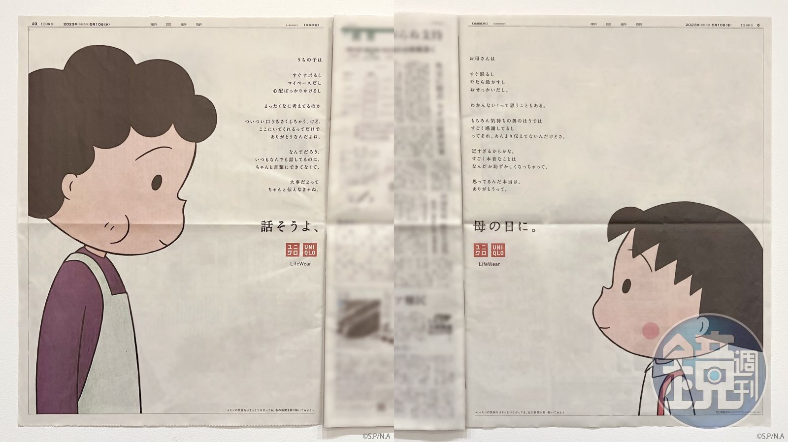 當時這套以媽媽「溫柔的謊言」設計的廣告,成功引起大批日本網友的關注和討論;而今年UNIQLO再度推出母親節廣告,這次請到了《櫻桃小丸子》的小丸子母女檔。UNIQLO分別買下了《朝日新聞》和《中日新聞》等報紙兩個頁面的廣告,一頁放的是媽媽的獨白,一頁則是小丸子的獨白。