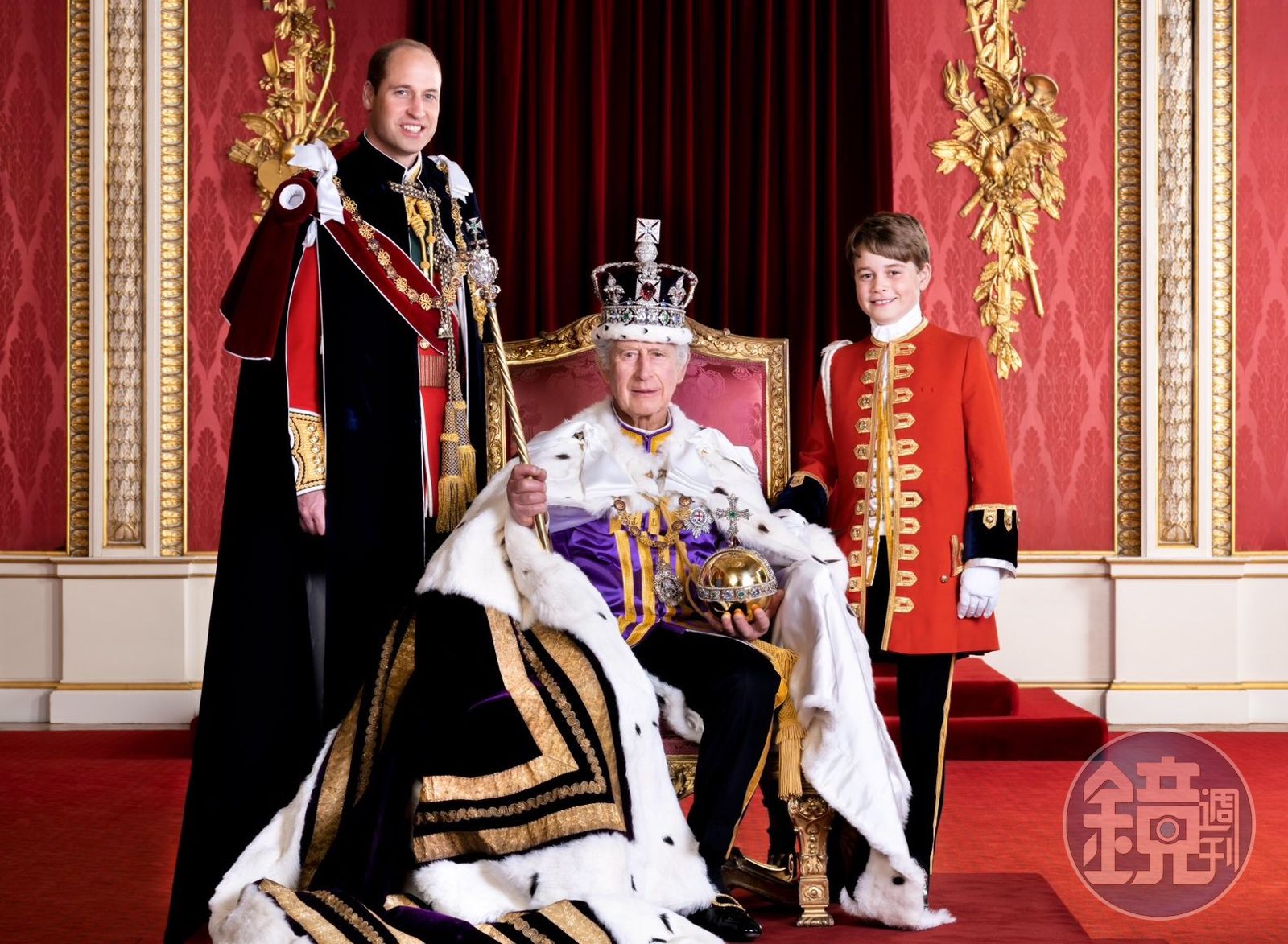 照片中,可見查爾斯三世戴著帝國王冠、身披加冕長袍,手持主權之球和十字權杖,坐在1902年為了加冕典禮打造的寶座上。站在他右側的是王位第一順位繼承人威廉王子,左側則是王位第二順位繼承者喬治王子,氣勢非凡。