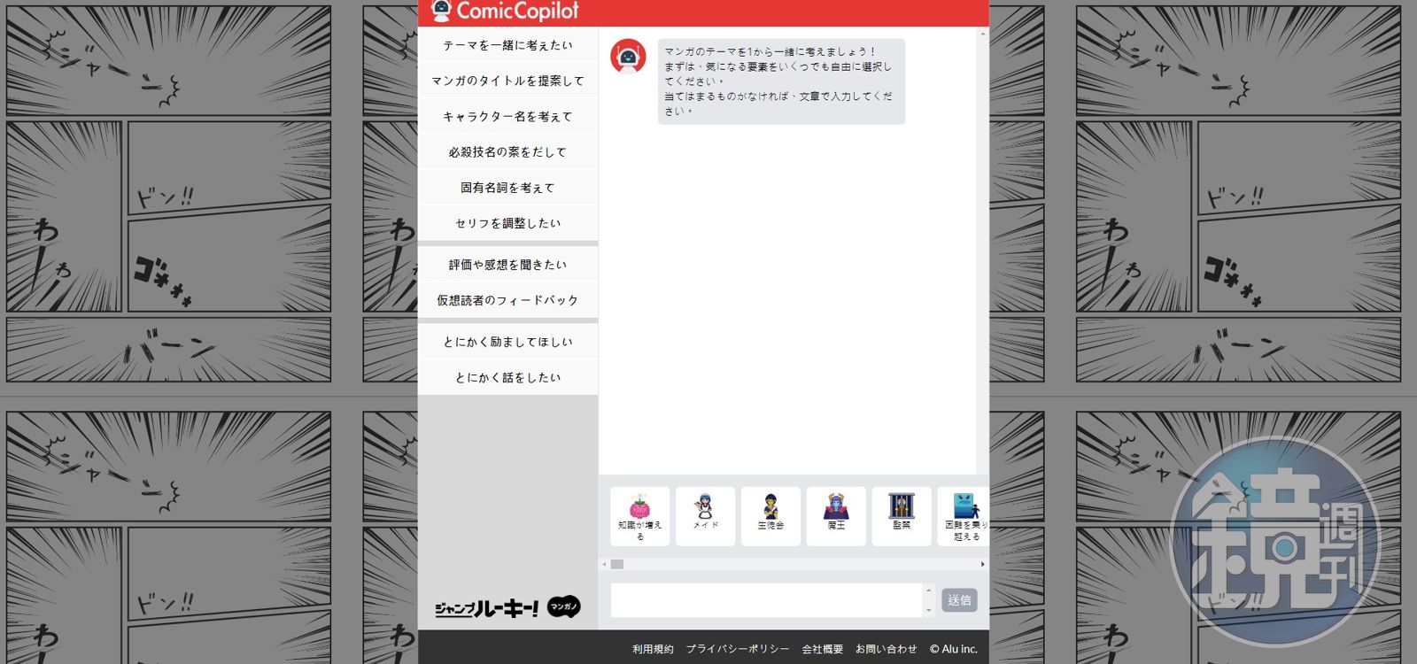 Comic Copilot是由新創科技公司「ALU(アル)」與少年Jump+編輯部合作,利用OpenAI 提供的對話式AI「ChatGPT」所整合而成的漫畫創作輔助AI。漫畫家遇到創作上的難題可以透過打字直接詢問AI,舉凡主題、書名、故事大綱、角色名字甚至必殺技想不出來,都能透過AI得到回饋。