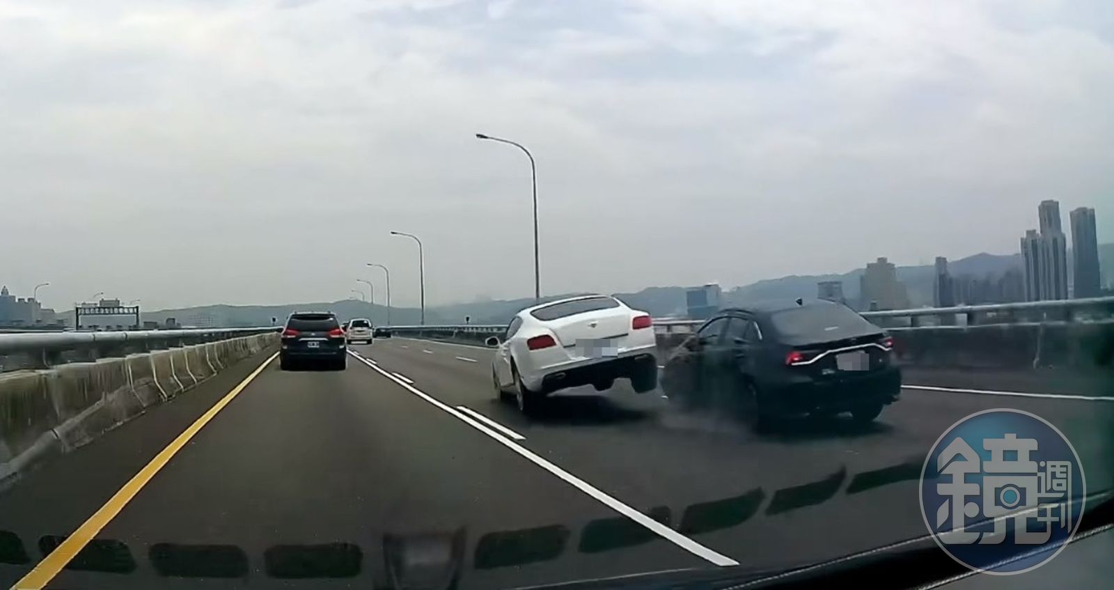黑色豐田轎車和白色賓利發生擦撞,所幸兩名駕駛並無明顯外傷。(翻攝自爆料公社)網友在「爆料公社」貼出一段影片,寫下「賓利哭哭」。根據行車紀錄器畫面顯示,原本行駛在外側車道的黑色豐田汽車,準備切入中間車道,而後方一台白色賓利行駛而來,黑色轎車似乎沒有抓準距離,直接切入,結果就撞上賓利車尾。 賓利失控撞上護欄,車身180度大轉向,兩台轎車就這樣互相推撞一小段距離後才停下。警方獲報後立即趕往現場處理,據悉,兩名駕駛無明顯外傷,隨後被送往林口長庚醫院檢查。