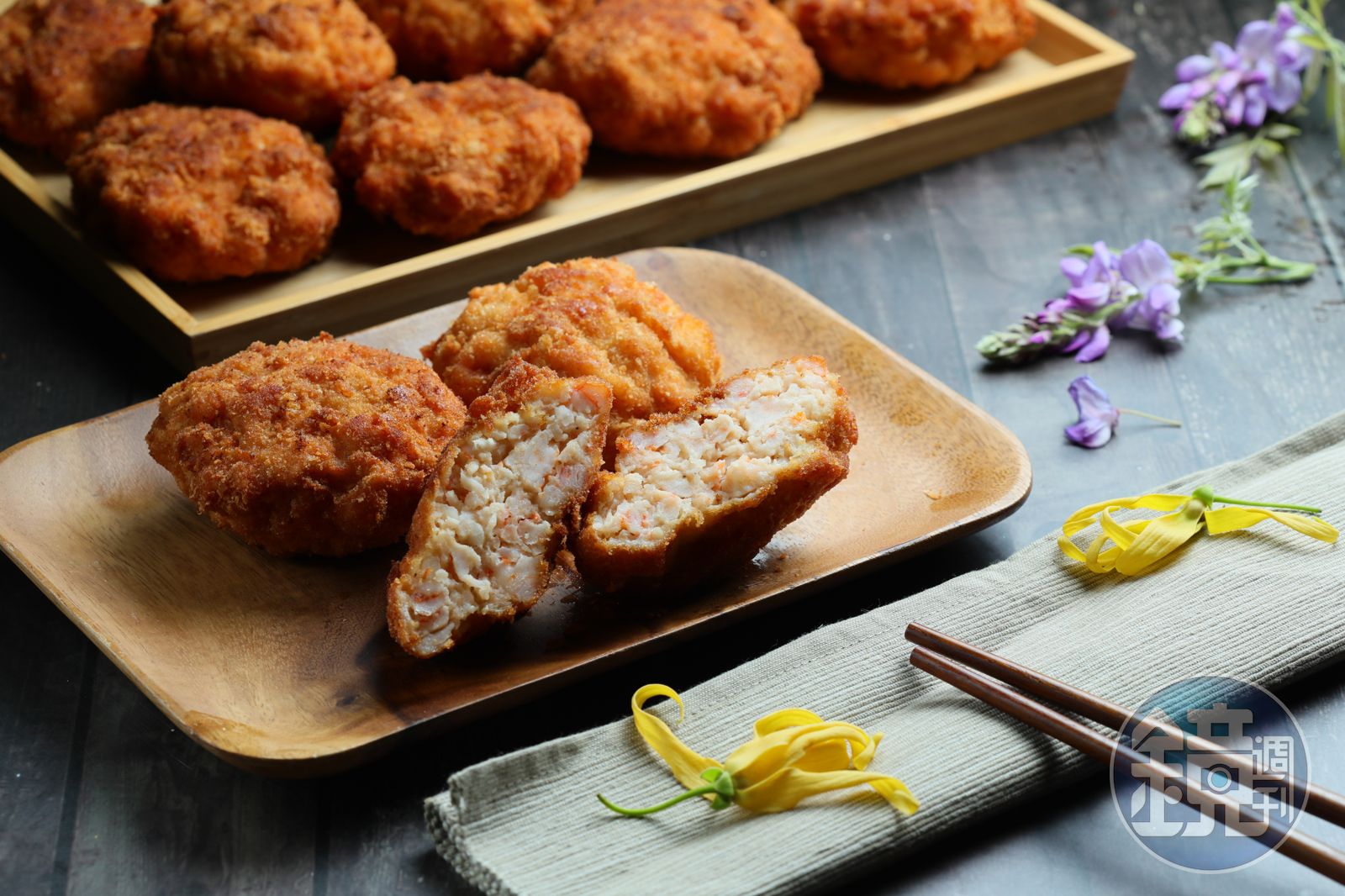 由於這道菜相當費工,又要專心對付。所以明福台菜只限量供應,不是隨叫隨有。我今天第一次做就請攝影來拍照又錄影片,著實大膽。不過也因為第一次做怕失敗,所以捏蝦球時,捏得比較大一些,這樣炸的時候比較不怕散開。因此不切開還可能被誤會成菠蘿麵包。不過,攝影記者可以作證,我的金錢蝦餅鮮香味美,不輸明福現做喔。(真好意思自己說)
