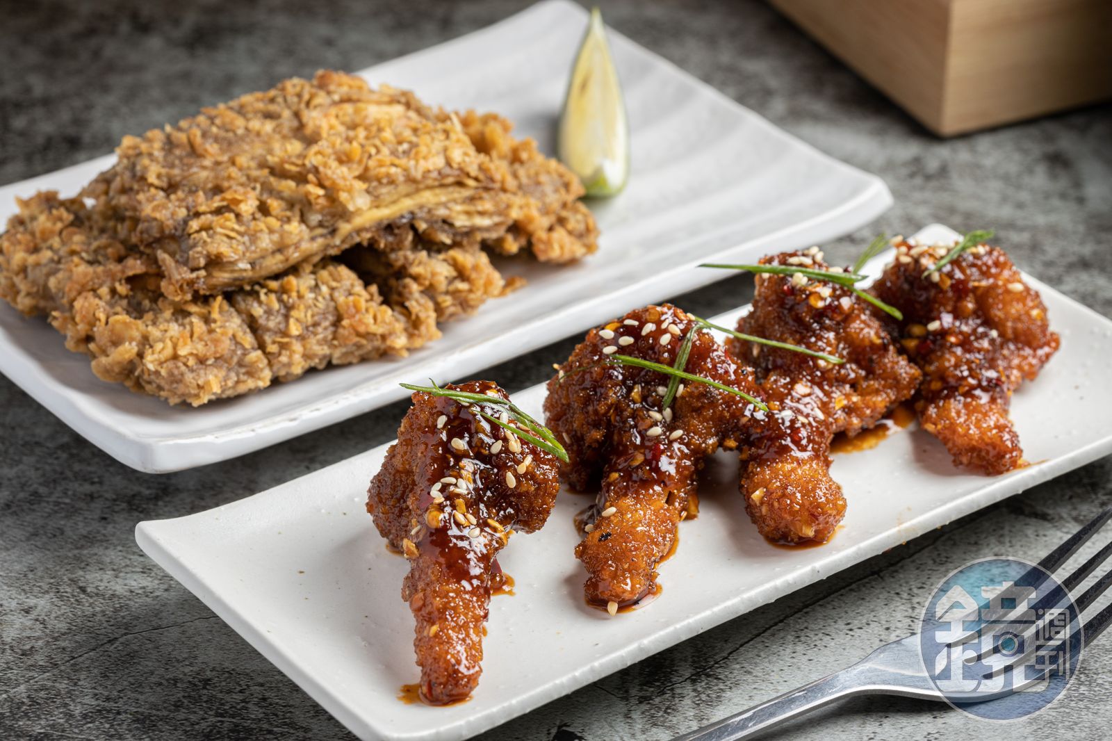 不過我第一次來吃飯時卻是被主廚的炸物小點給驚豔到了。來自張哲維家鄉宜蘭的青草臭豆腐,有麻辣和油炸兩種,油炸版酥香涮嘴,比專業店還專業,麻辣版香氣逼人;用花椰菜偽裝的韓式辣G翅甜辣可口,以假亂真,蔬菜外頭裹的脆漿和甜辣醬汁是他去韓國受訓時學得的技巧;以海苔片假裝的炸魚皮,淋上莎莎醬更迷人;其他還有主廚用千張包的糯米腸、蔬菜漿做的炸蝦捲,以及混合杏鮑菇、金針菇、猴頭菇、豆皮的唐揚G,根本是一個可以獨立營業的蔬食版炸物攤。