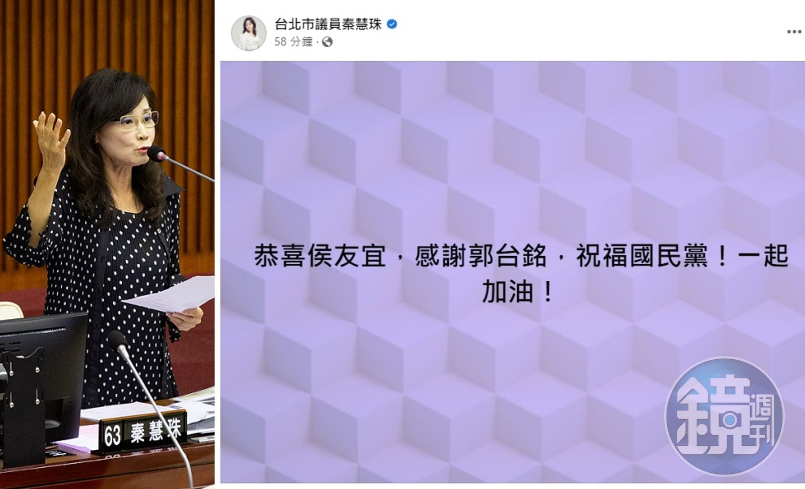 國民黨中常會還沒開,台北市議員秦慧珠就搶先在臉書發文,提前恭喜新北市長侯友宜。(右圖翻攝臉書)發布時間:2023.05.17 09:35 臺北時間