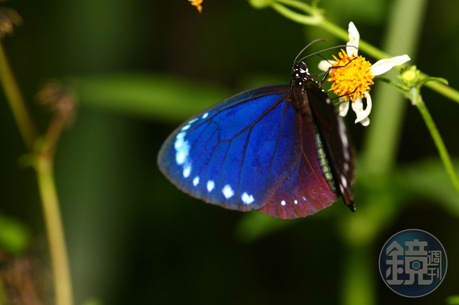 高速攝影機可以拍到一般攝影設備難以捕捉到的紫色蝶翅,圖為小紫斑蝶。 (牽猴子提供)