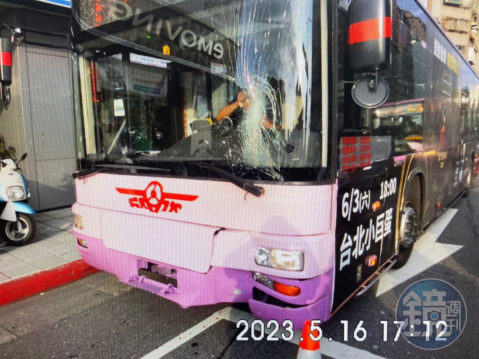 公車車頭因撞擊造成多處損毀。(翻攝畫面)發布時間:2023.05.18 15:31 臺北時間