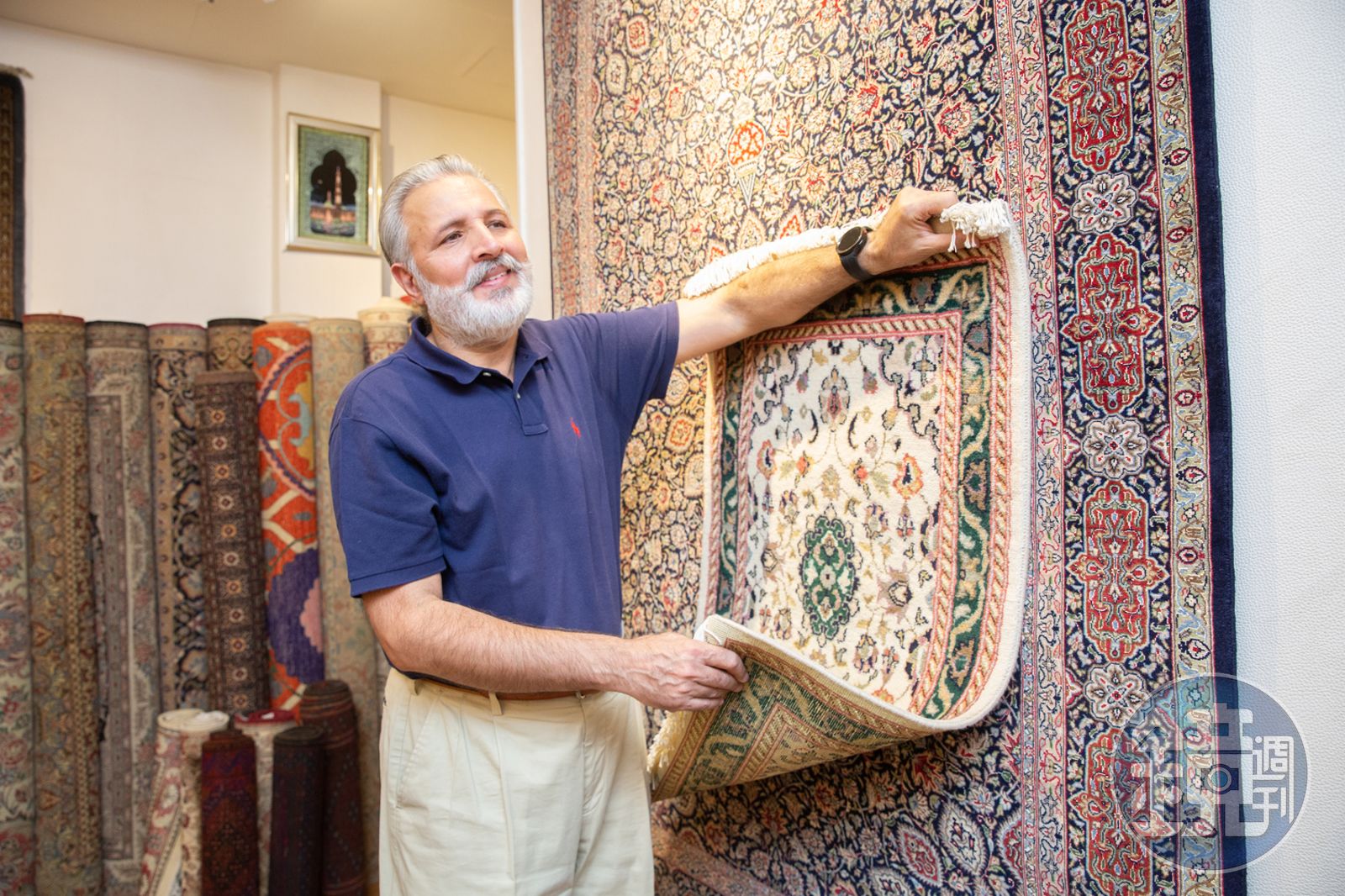 推開波斯洋行的玻璃門,店內擺設看似樸實,其實很不簡單,覆蓋牆面、圖騰特殊到有些魔幻的地毯,彷彿會把人轉移到異國他鄉。或是懸掛、或是捲起的上百張地毯全是手工編織、獨一無二,年分最久達300年,各種尺寸,售價數千到百萬元不等,老闆羅樹德說:「買我們地毯很多都是豪宅,例如帝寶。地毯有個好處是小偷不懂它的價值。」