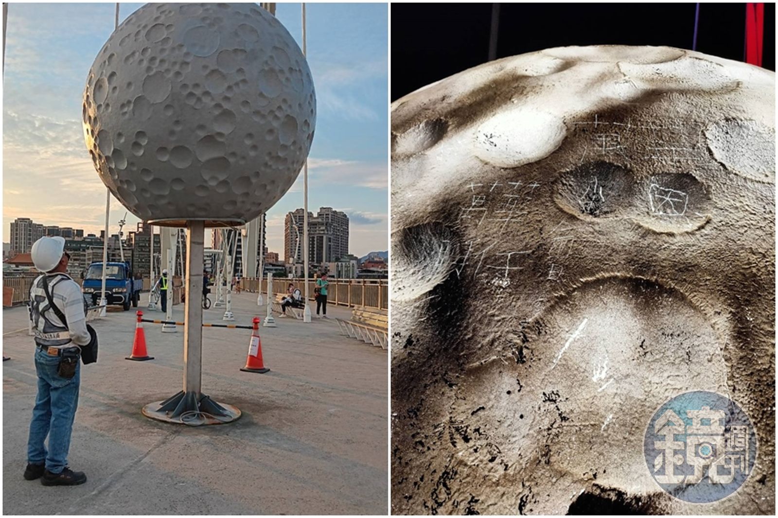 缺乏公德心的民眾任意刻字導致月球「破相」。(新北高灘處提供)美麗的裝置藝術總是會吸引許多人駐足觀賞,可惜缺乏公德心的遊客在月球表面寫字及刻字,造成月球表面受損,也影響到整體景觀。因該作品表面已毀損,需將原有外層漆料噴砂去除,再漆上半透光特殊塗料,處理工序相當繁複,無法於現場修補故已吊離進廠整修。