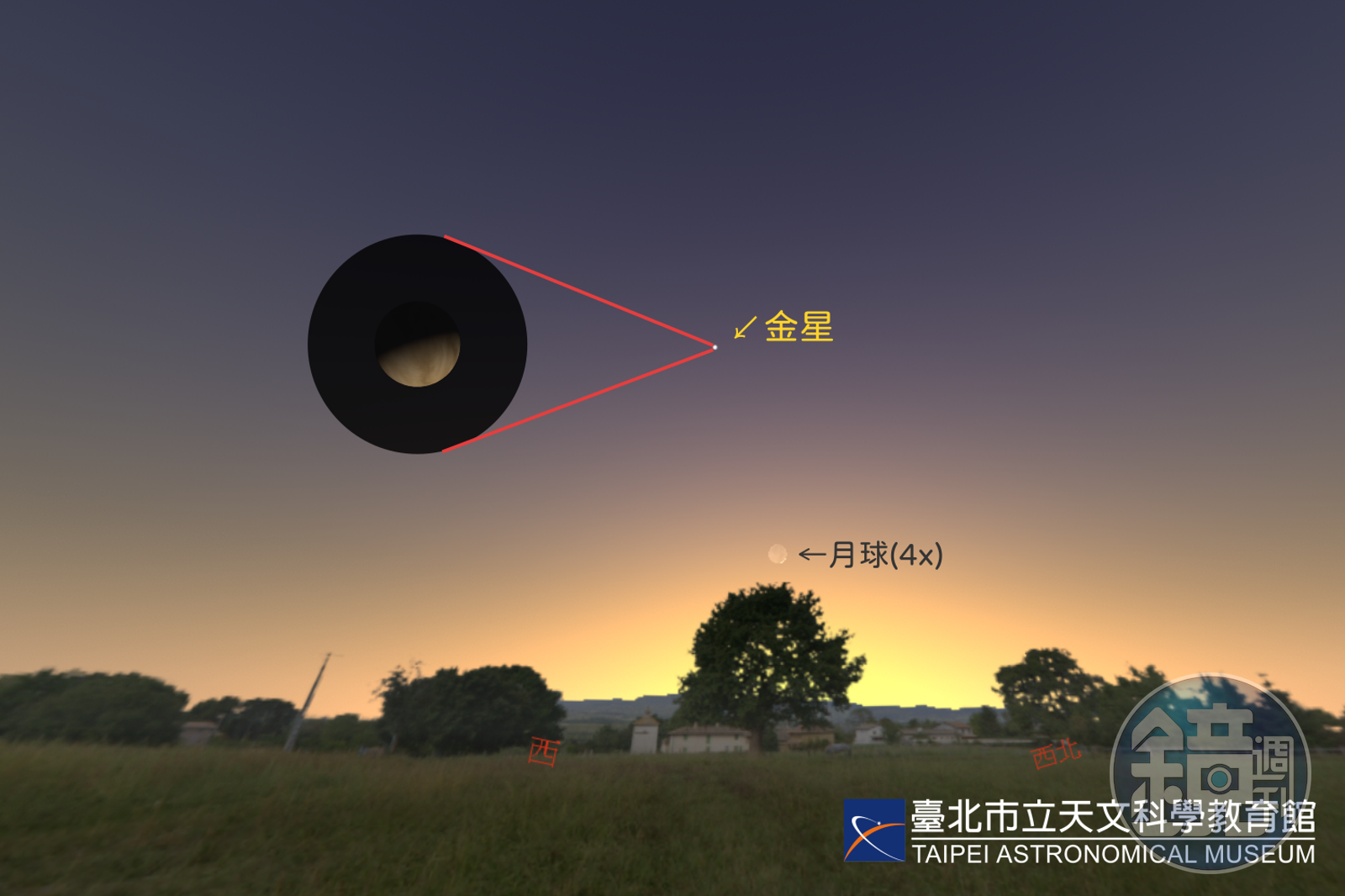 接下來金星的亮度將持續升高,至7月時達到最亮,在這段時間裡都是觀賞的絕佳時間,天文館也提醒民眾,可在傍晚時抬頭向西方天空看看這顆明亮的行星。如果有10倍以上的雙筒望遠鏡或小型望遠鏡,還可以看出金星如弦月般的形狀,猶如另一個小月亮。