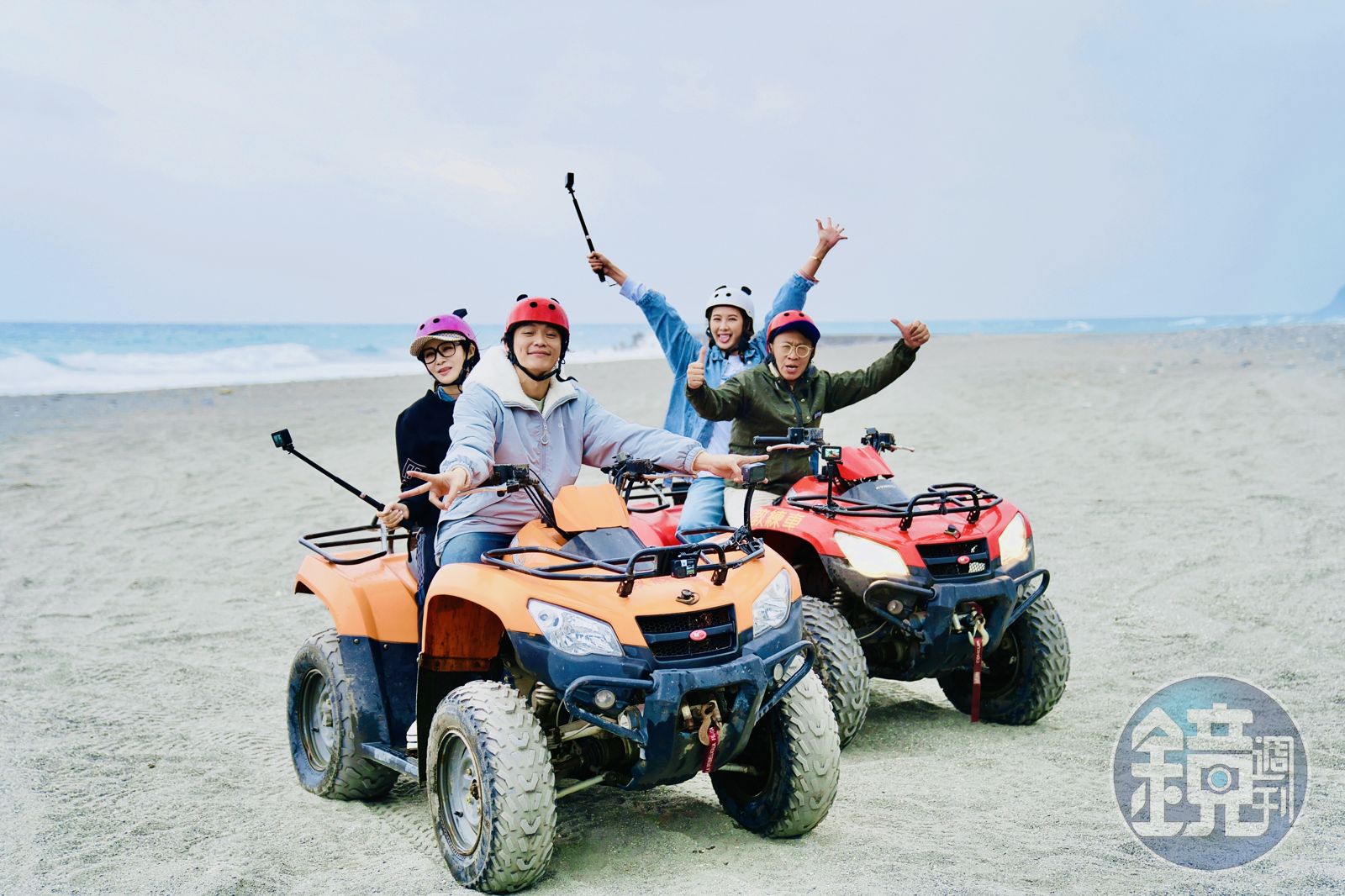 午後全員挑戰騎乘沙灘車,分不清油門及剎車的蔡秋鳳竟化身熱血女飆仔,自告奮勇要載黃鐙輝飆沙去,還沒出發就把他嚇得冷汗直流。