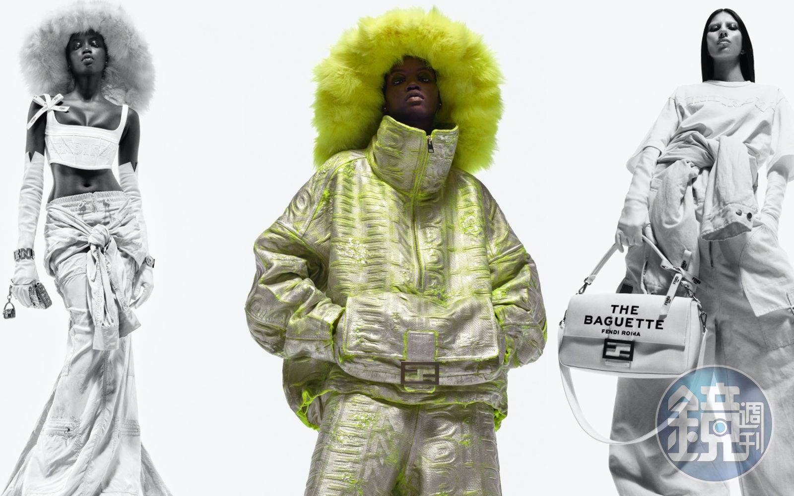 被重新詮釋的螢光黃色FENDI Roma logo圖案,以微小印花圖案及壓花浮雕圖案之姿,出現在從時裝到白色皮革包款等單品上,讓各式包款有了搶眼的視覺效果;Baguette包款外側大剌剌地寫上的「THE BAGUETTE」字樣,則是述說著自己的時尚宣言。
