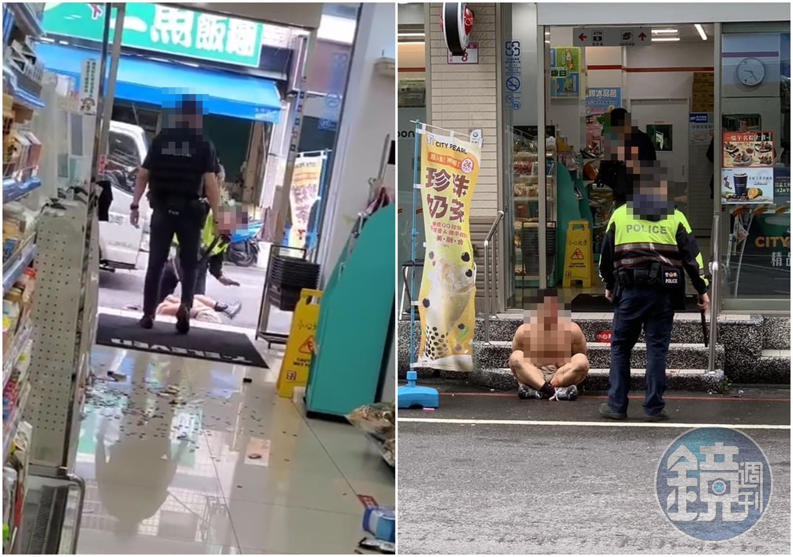 朱姓男健身教練大鬧超商,被噴辣椒水壓制坐倒門外,卻遭員警以警棍暴打。(翻攝自臉書)發布時間:2023.05.22 17:44 臺北時間