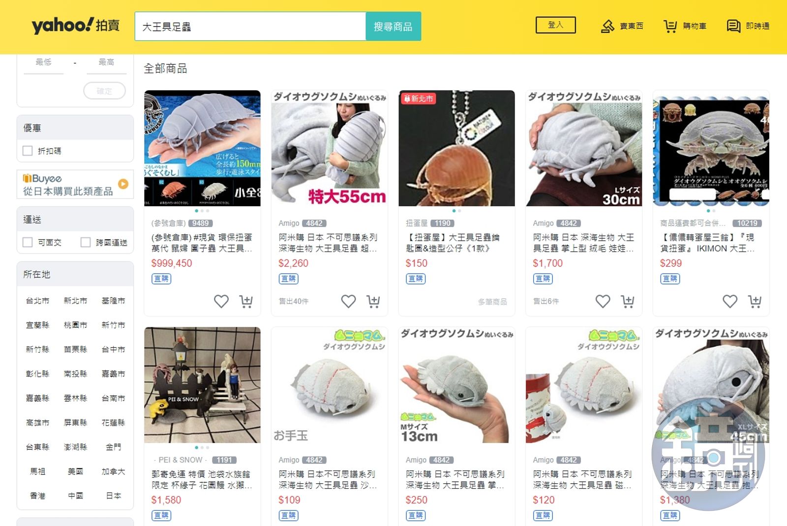 點進貼文的連結是來自Yahoo奇摩拍賣,搜尋關鍵字「大王具足蟲」會出現不少玩偶商品,價格依照尺寸有所差異,其中「特大55cm」的玩偶,約莫要價2,000元左右。