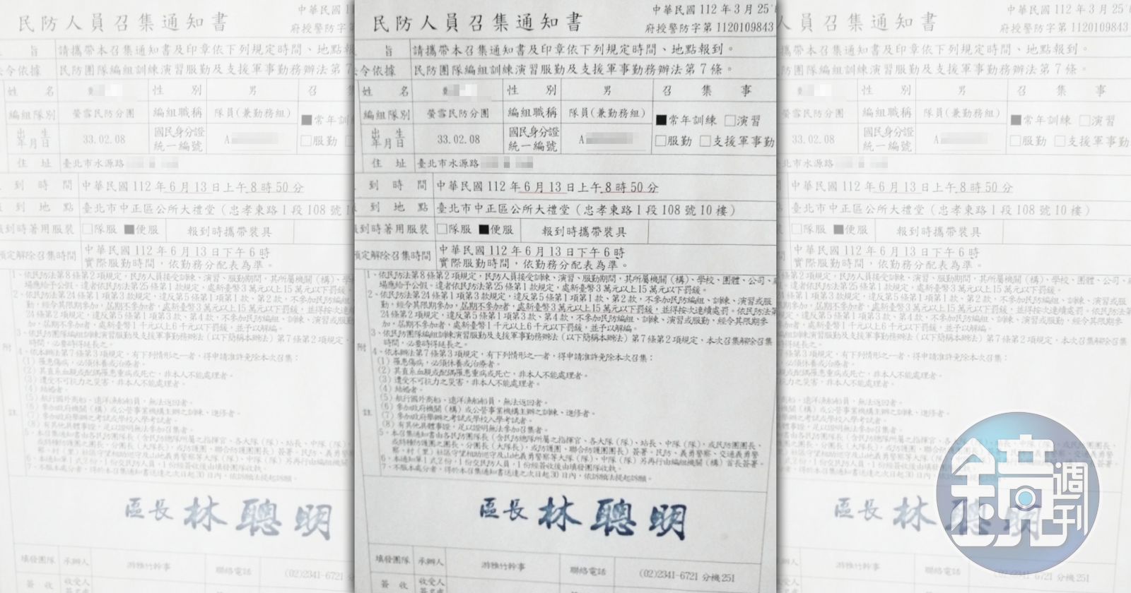 根據近日網傳圖片顯示,台北市中正區的民防團隊編組訓練演習將於6月13日舉行,該份民防人員召集通知書上的「受召集人」是一名出生於民國33年、已將近80歲的鄭姓男子。通知書上載明,若未如期參加訓練,將處新台幣3萬元以上、15萬元以下罰鍰。