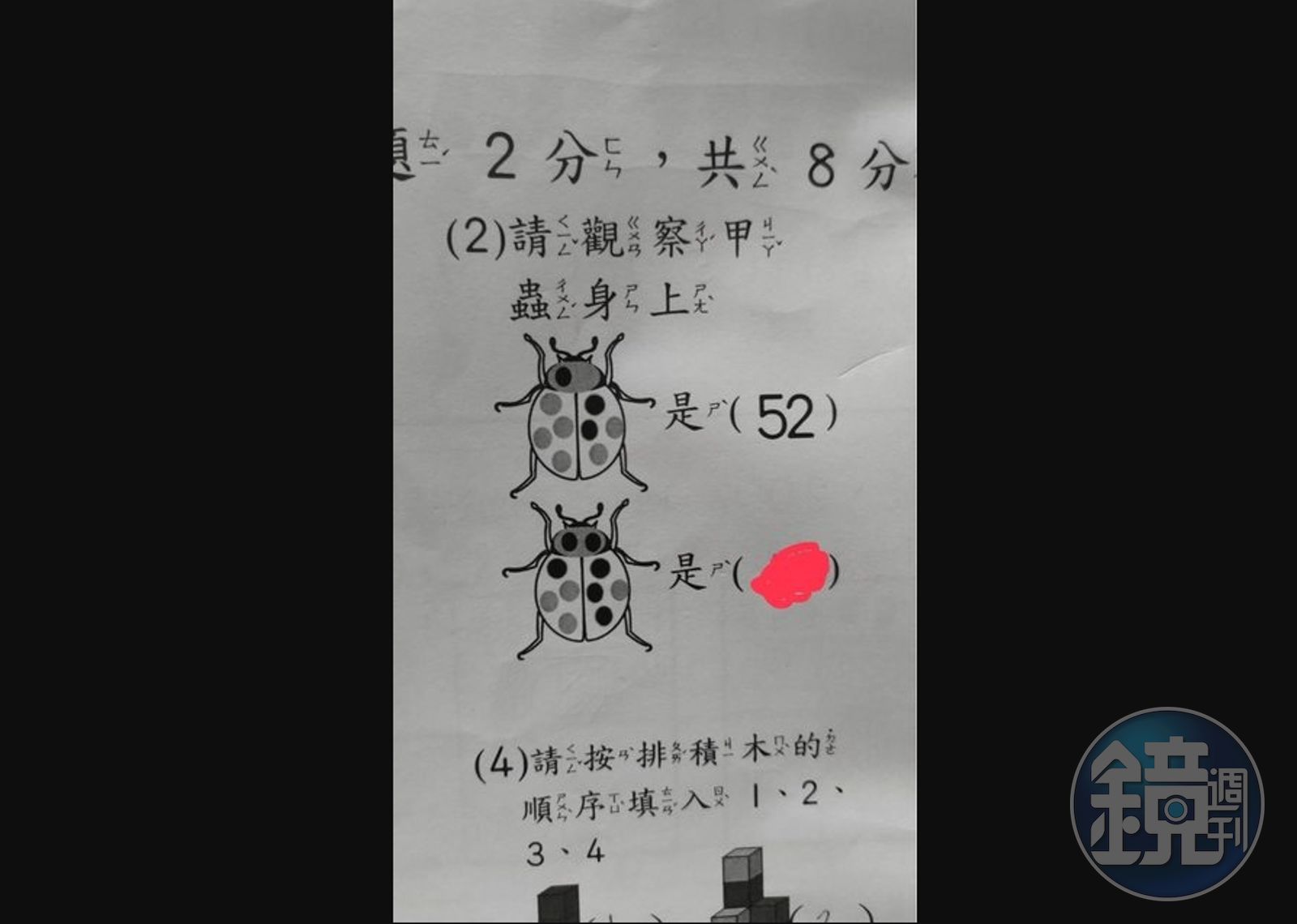 原PO在PTT貼出一道幼兒園數學題,圖上有兩隻花色不同的甲蟲,背上有灰色和黑色圓點,題目寫著「請觀察甲蟲身上」,第一隻甲蟲的頭部左側有1個黑點、右側沒有點,身體左側有4個灰點、右側有2個黑點和2個灰點,代表是52,再以此圖推算第二隻甲蟲花色所代表的數字。