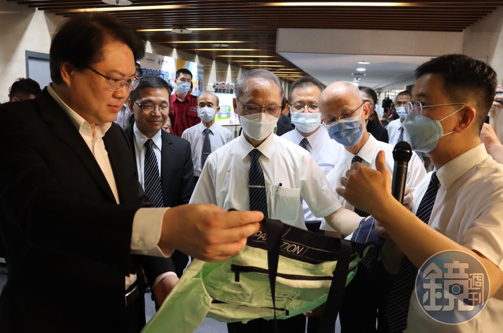 林右昌部長特別對一款緊急避難包感興趣,這是由臺灣設計公司「Lajos Design」及「選選研」與慈濟合作,設計方經由比較臺日兩地不同的防災概念與防災文化,彙整設計出一款適合緊急避難約一至兩天的避難側背包,並經由大愛感恩科技公司利用回收寶特瓶所再製而成的紡織布料,質地輕柔卻兼具防潑水與韌性極佳的特性,非常適合應用在避難過程中,可能對包包材質面損傷的考量。
