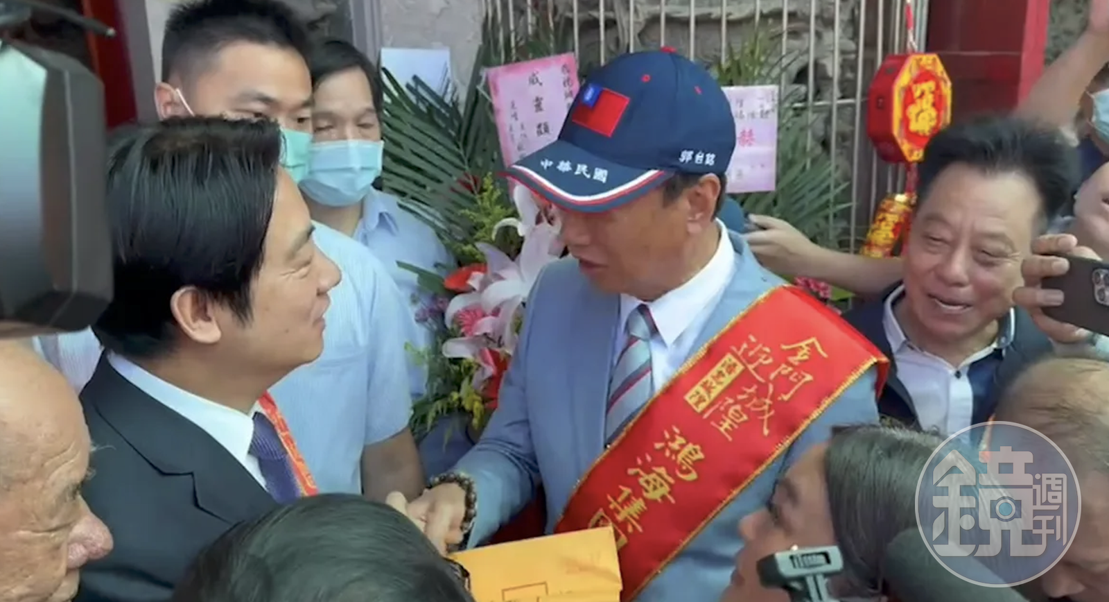 不過,郭台銘和賴清德今一前一後抵達城隍廟參拜,兩人在城隍廟外握手,賴清德告訴郭台銘:「這段時間辛苦了。」郭台銘則拿出寫著「和平與戰爭」的牛皮紙袋,表示裡面是兩岸和平宣言,他過去也和賴清德一樣在金門當兵,兩人短暫交談後,賴清德收下郭台銘的和平宣言。