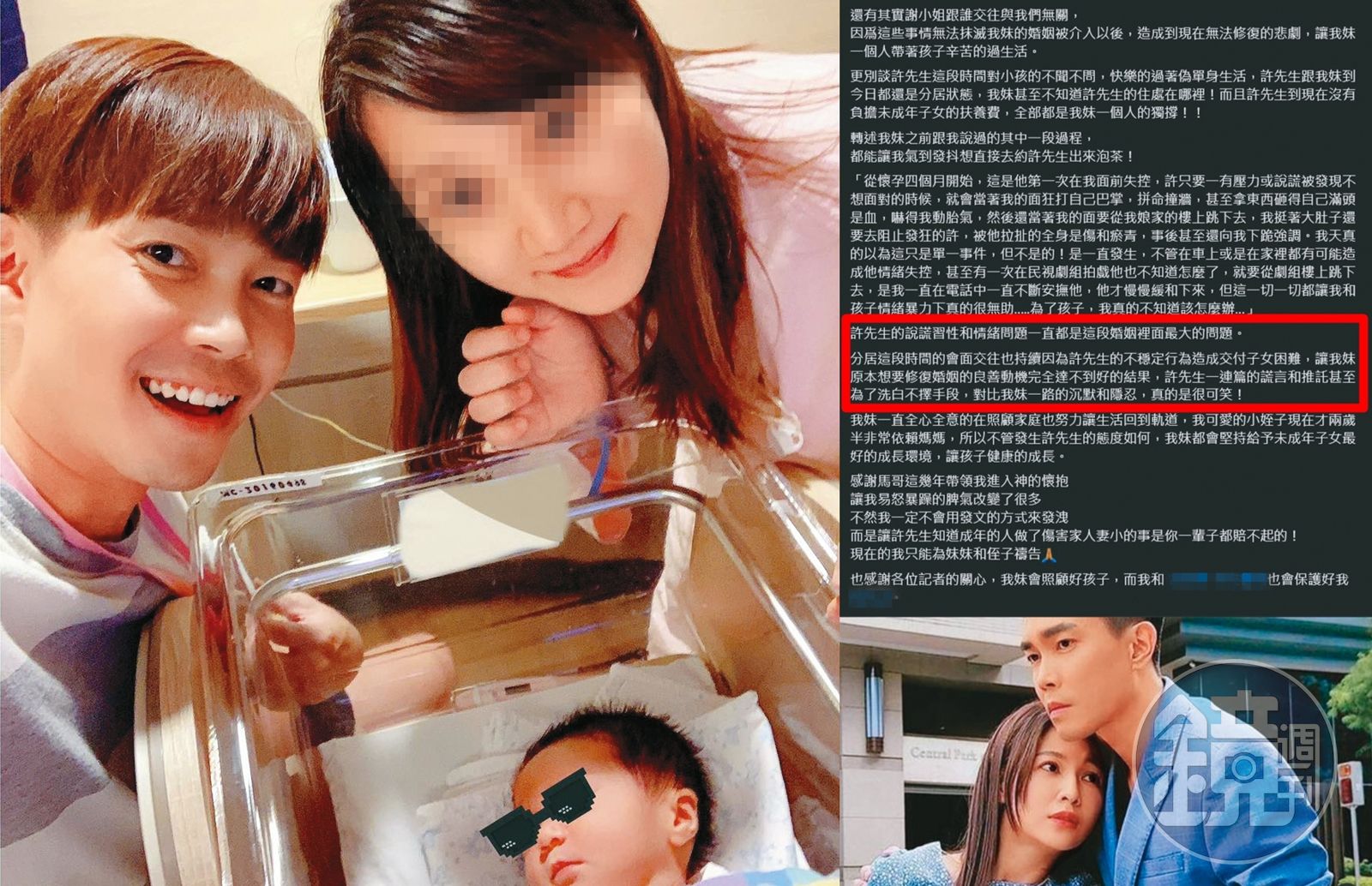 日前亞希乾哥引用本刊報導謝京穎跟張書偉的新聞,痛批許仁杰「以『拖』字訣不解決失敗的婚姻。」(翻攝自亞希乾哥臉書)算了一算,從本刊去年9月開始察覺許仁杰的婚姻狀態有異,直到今年5月,總共8個月的時間,許仁杰對於老婆亞希呈現不給錢又不給關懷的狀態。