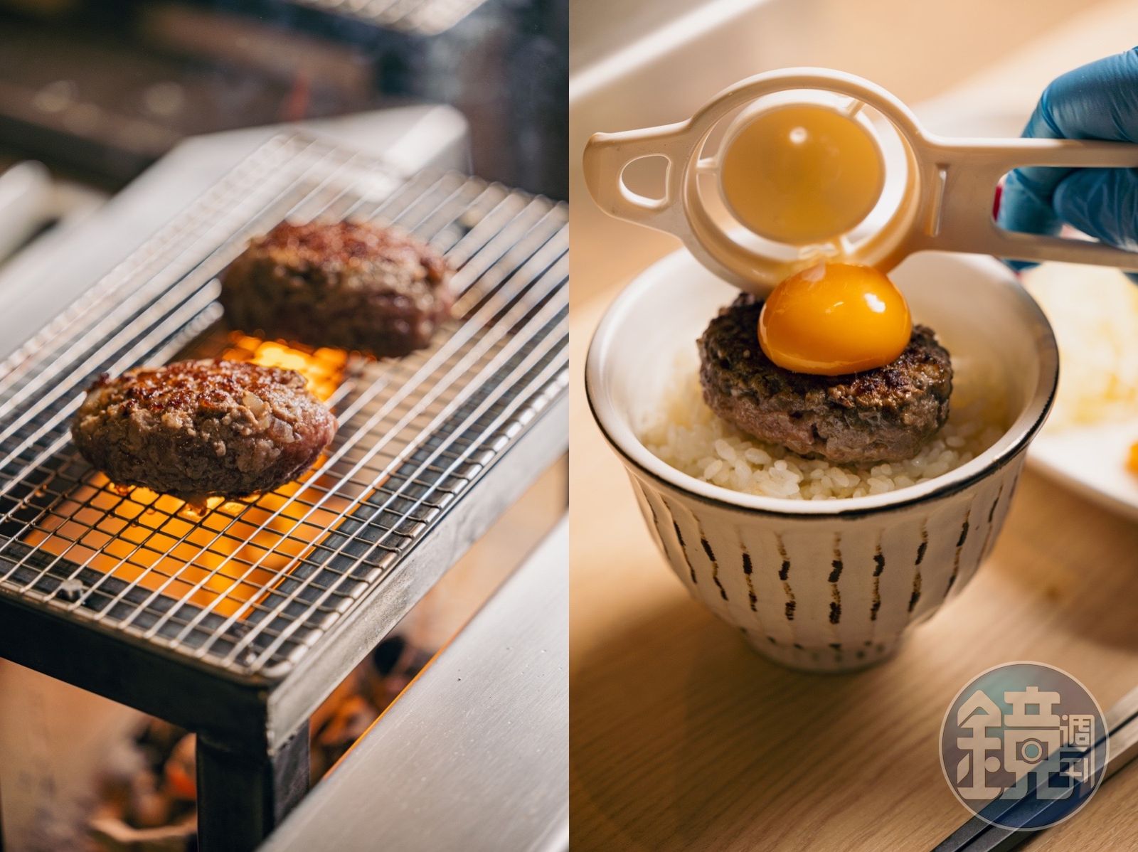 為了避免用直火炭烤漢堡排時,會產生大量燻煙,店家改以先煎後烤的方式料理。會先在鐵板上把漢堡排的兩面,煎出微微焦色,再蓋鍋讓熱度直達中心,拿捏適當熟度後,會再擺到客人面前的炭爐上,讓肉排吸附炭香、鎖住肉汁。