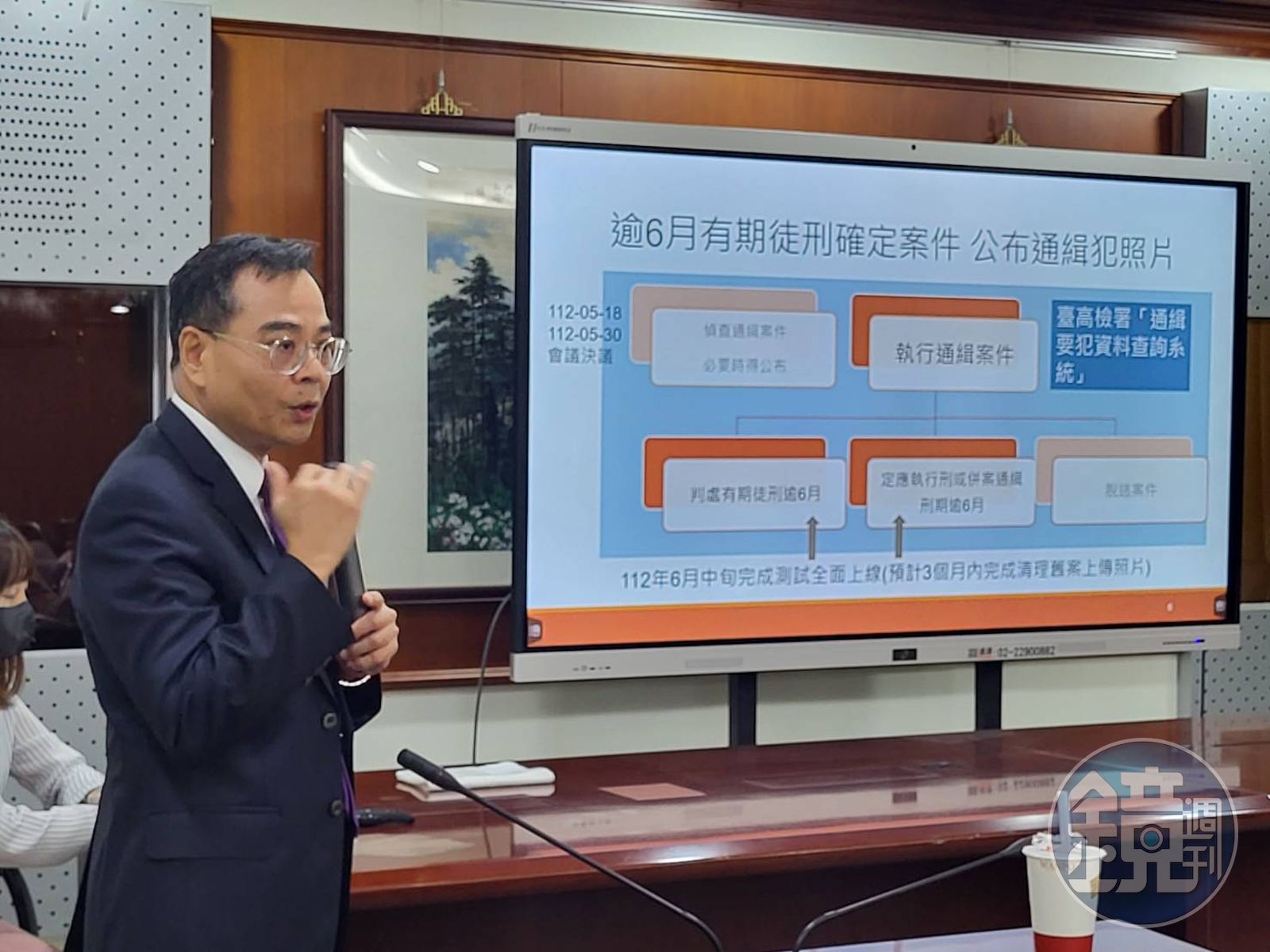 檢察司長郭永發表示,通緝書正本除提供內政部警政署外,副本亦送通緝犯戶籍地司法警察機關,以加強通緝犯查緝效能。為確保偵審、執行及提升查緝通緝犯之效能,法務部在今年2月15日,已邀集高檢署、調查局及警政署先行整合「通緝犯資料查詢平台」,近日再邀集各地檢察署、內政部戶政司等單位共同研商,達成諸多共識,全面緝捕通緝犯到案。