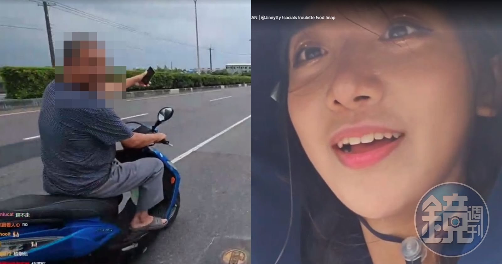 接著鏡頭轉向馬路,可以看到該名阿伯沒戴安全帽騎機車,拿著手機對企鵝妹狂拍,儘管企鵝妹不斷用中文請他不要這樣做、很危險,但阿伯仍持續騷擾跟拍,表示自己在網路上看到企鵝妹,還向企鵝妹自我介紹就住在附近村莊,講不聽的行為讓企鵝妹崩潰喊「Please stop!Holy shXt!」「What are you doing?」最後阿伯才默默騎車離去,但仍是單手騎車、單手使用手機。