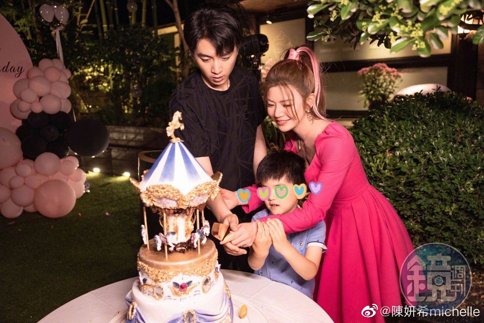 陳妍希(右)與陳曉(左)蹲在粉紅拱門前一起甜吻兒子,最大程度地散播著他們一家三口的幸福甜蜜。(微博圖片)陳妍希在微博分享昨日生日趴的照片,會場布置成粉紅色,壽星也穿著芭比粉色洋裝、用粉紅髮帶把頭髮紮成高馬尾,還留了一撮粉紅挑染,加上老公與兒子一家三口全到齊,整個生日趴都充滿著粉紅泡泡。