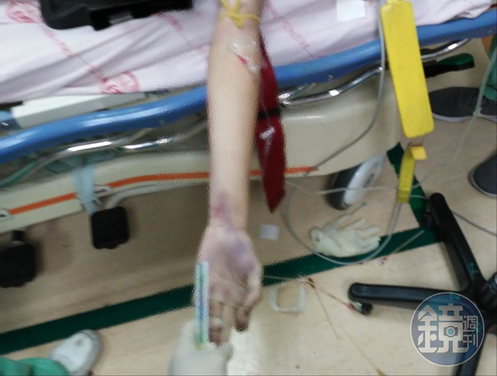 家屬友人告訴本刊,4天前透過中國醫藥大學協助,取得賴生第一時間送醫的照片,院方告知當時只在賴的左手臂插管搶救,有照片為證;同時也拍下多張可疑傷痕,包括嘴巴上唇處有咬痕,左手臂有不明傷口;甚至在左手拇指指甲處有疑似血漬。