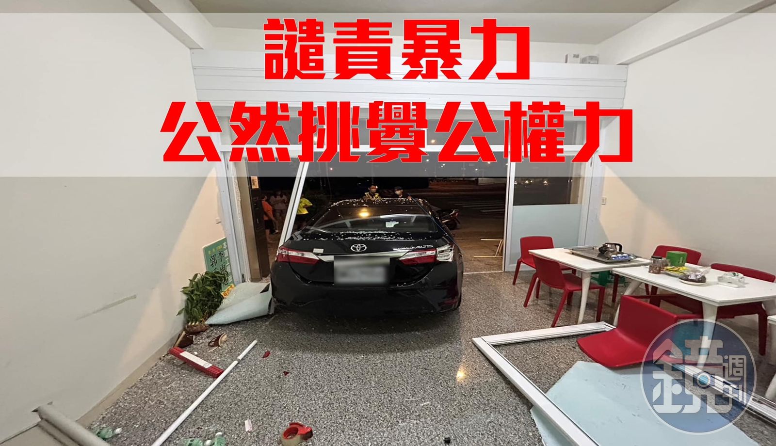 晚間6點許,其中一方的洪姓男子開著自小客車折返服務處,以倒車的方式衝撞服務處玻璃門,隨後棄車逃逸。