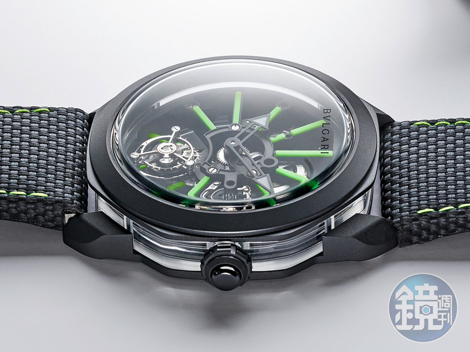 只不過,做為一個熱情奔放的義大利品牌,哪裡有可能太低調呢?果不然,在其Octo Roma的年度新作之中,仍藏了一個充滿視覺風格的膠囊系列——Octo Roma Striking錶款。它採用了黑色鈦金屬、藍寶石水晶以及螢光綠的配色,錶如其名,非常地引人注目。