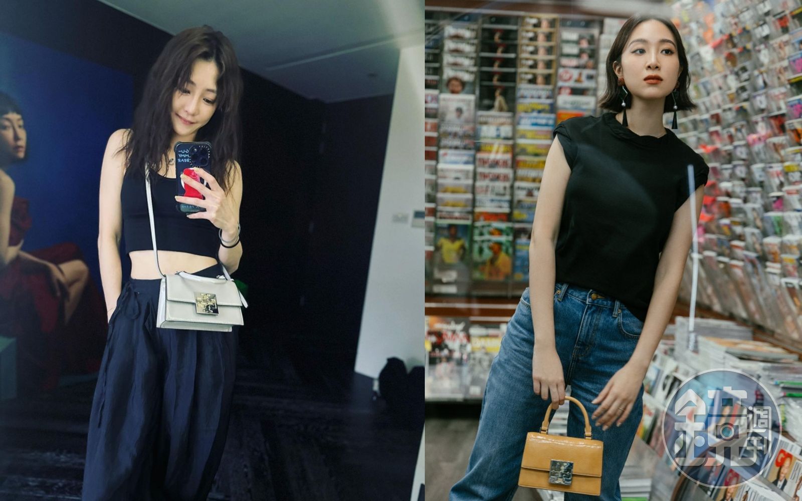 (左起)謝欣穎、Melinda的私服look已經有了TORY BURCH Bon Bon迷你手提包的蹤影。(TORY BURCH提供)發布時間:2023.06.07 15:09 臺北時間