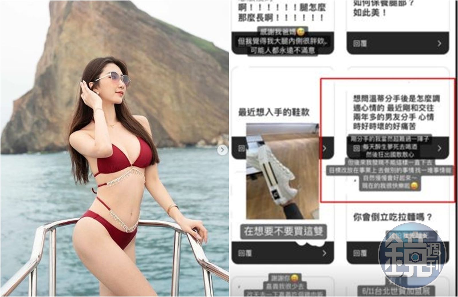 此外,她也回答了自己喜歡的男生類型,包括,乾淨、牙齒整齊、會運動、脾氣不要太差,「對我好,不要太摳」,對男生的底線則是「不要動手跟不要偷吃」。去年Wendy分手後說「人可以忍受一陣子,無法忍受一輩子,我們的三觀不合,從以前一樣的問題一直存在,一般女生無法承受的,我都承受了,我也累了放過彼此吧,去找瞎妹們約吧。」透露了分手原因。