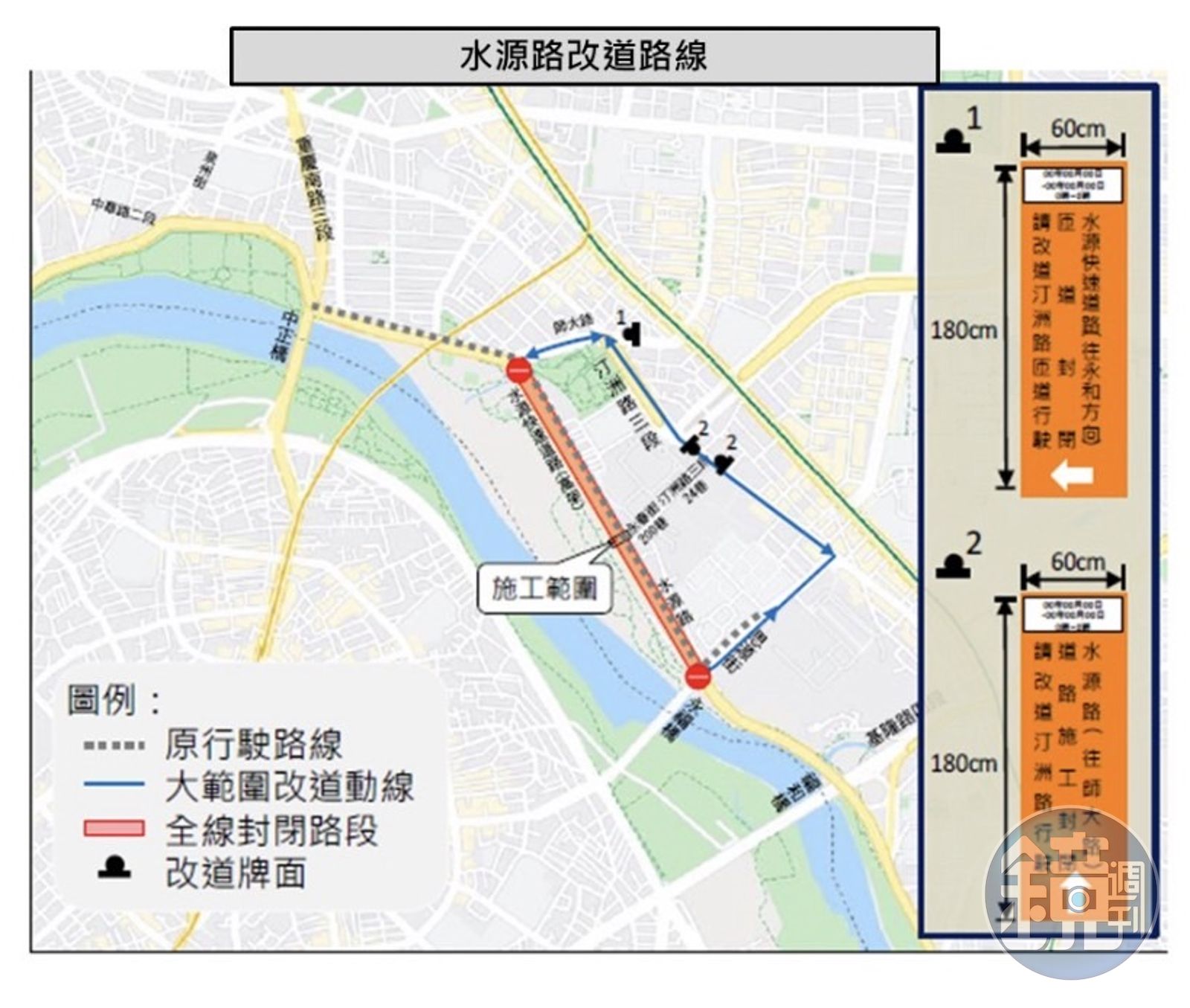 中正第二分局警方表示,因應水源路及水源快速道路封閉,提醒用路人提前改道,建議改道路線:水源路35巷往北至師大路段,可提早於汀州路三段、螢橋國中旁巷弄右轉進入水源路;水源快速道路往新店景美方向,因施工期間水源快速道路往南封閉,將強制在師大匝道進入平面道路,請駕駛人循羅斯福路平面往南。