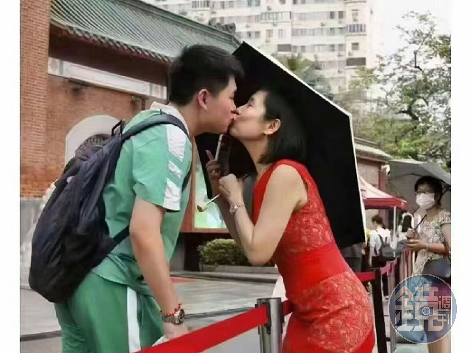 《南方都市報》記者在廣州越秀區執信中學考場外,捕捉到一對母子,媽媽穿著一襲紅色裙裝,陪著穿著綠色運動衣的兒子到考場,並為他加油打氣。更特殊的是,這位媽媽直接就在大門外給兒子來了一個「嘴對嘴熱吻」,剛好被《南方都市報》記者捕捉到。
